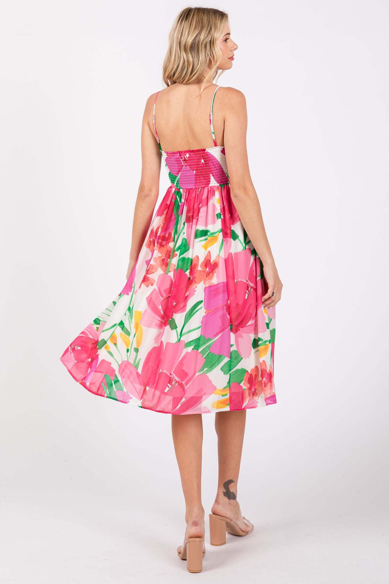 Pink Floral Smocked Chiffon Midi Dress