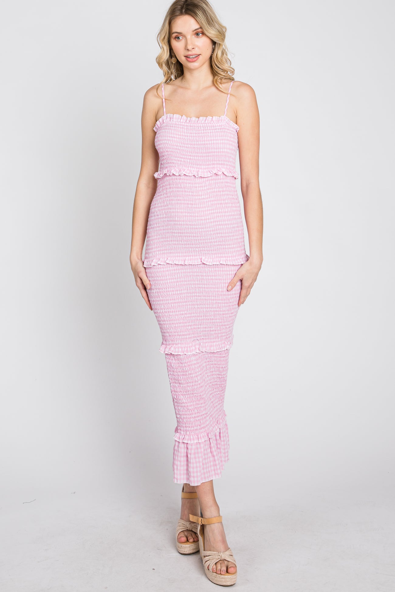 A gingham print, smocked maxi dress with a straight ruffle neckline, adjustable straps, and a tiered fitted body