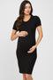 A ribbed fitted maternity midi dress featuring a mock neckline, long sleeves and a side slit.