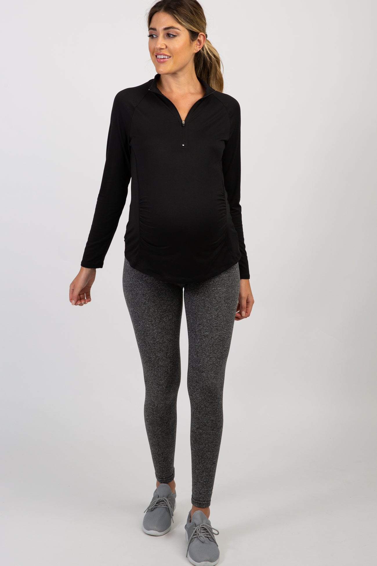 A solid hued maternity active top featuring long sleeves, a front zipper closure, and ruched sides.