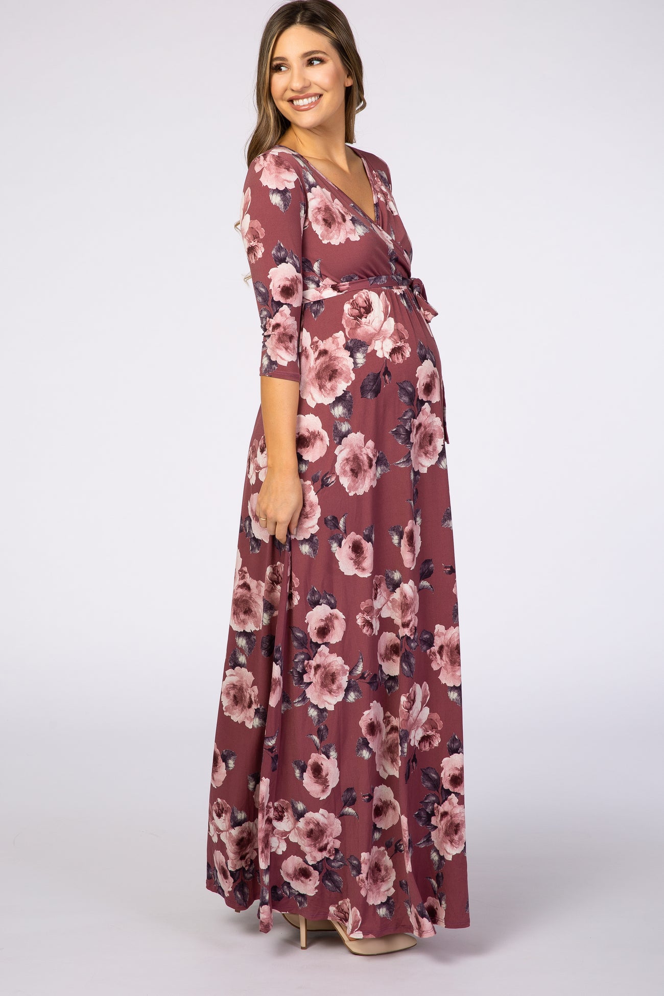 PinkBlush Mauve Abstract Floral Sash Tie Maternity/Nursing Maxi Dress