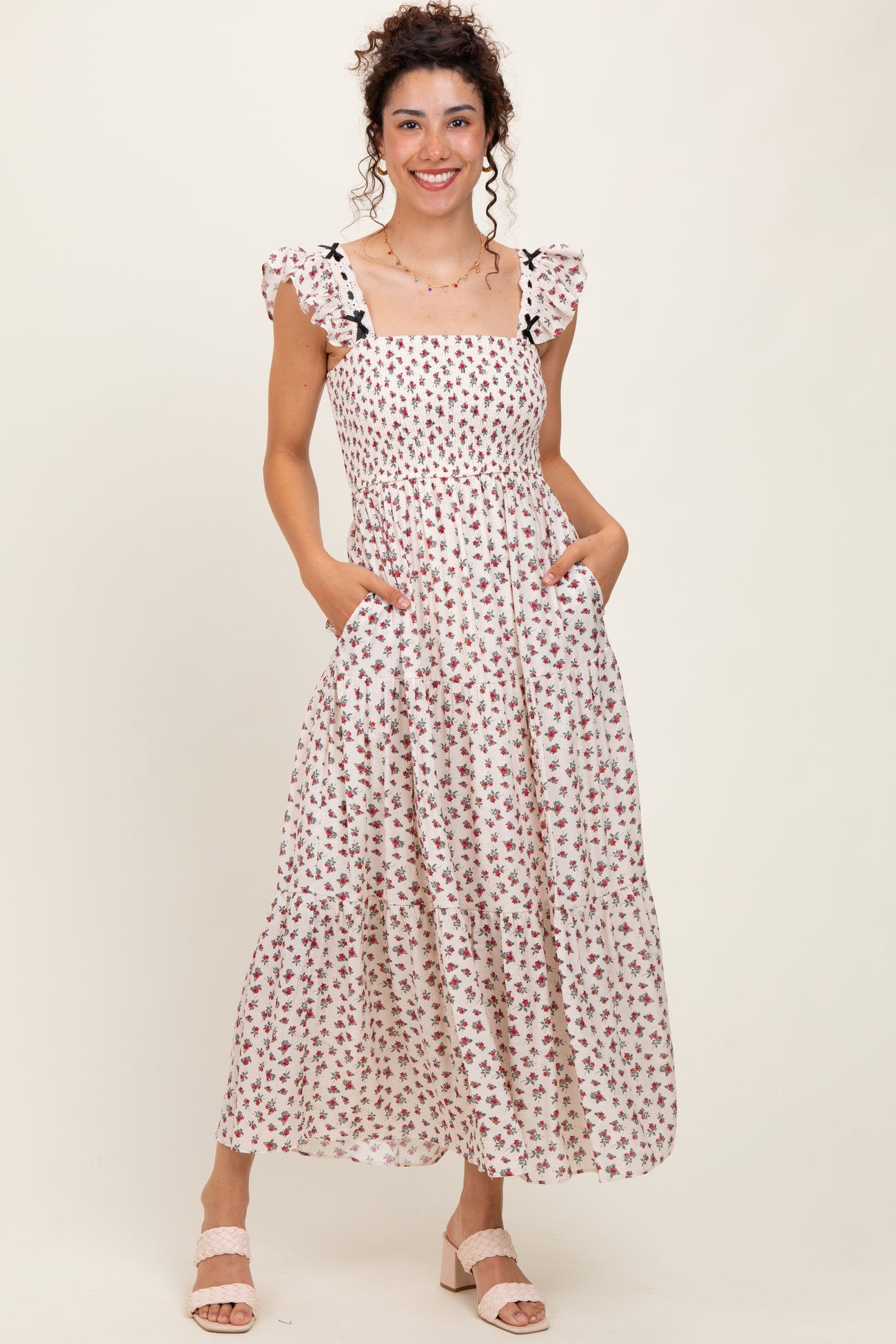 Red Floral Bow Trim Lace Detail Smocked Maternity Maxi Dress