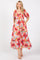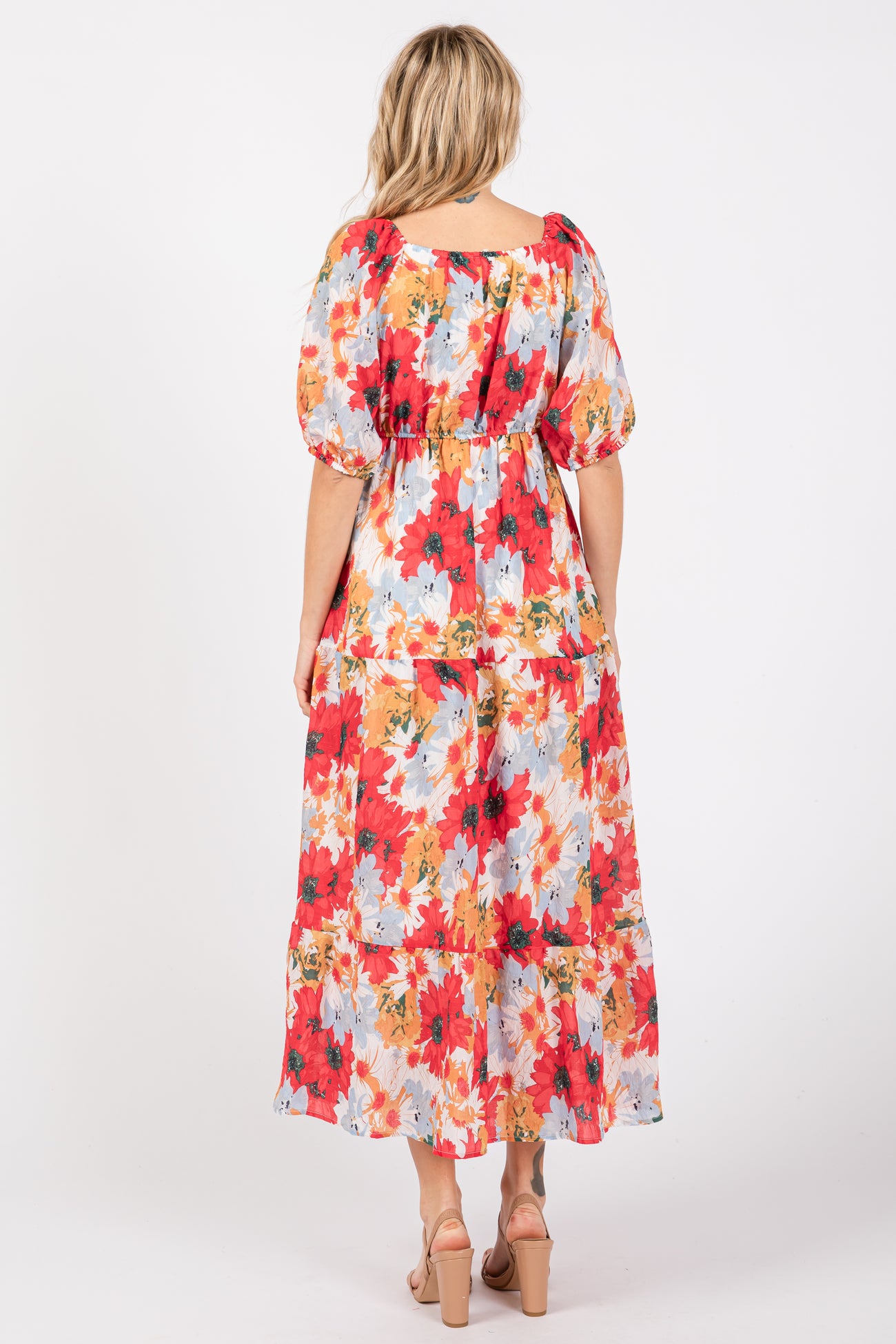 Red Floral V-Neck Short Puff Sleeve Tiered Midi Dress