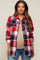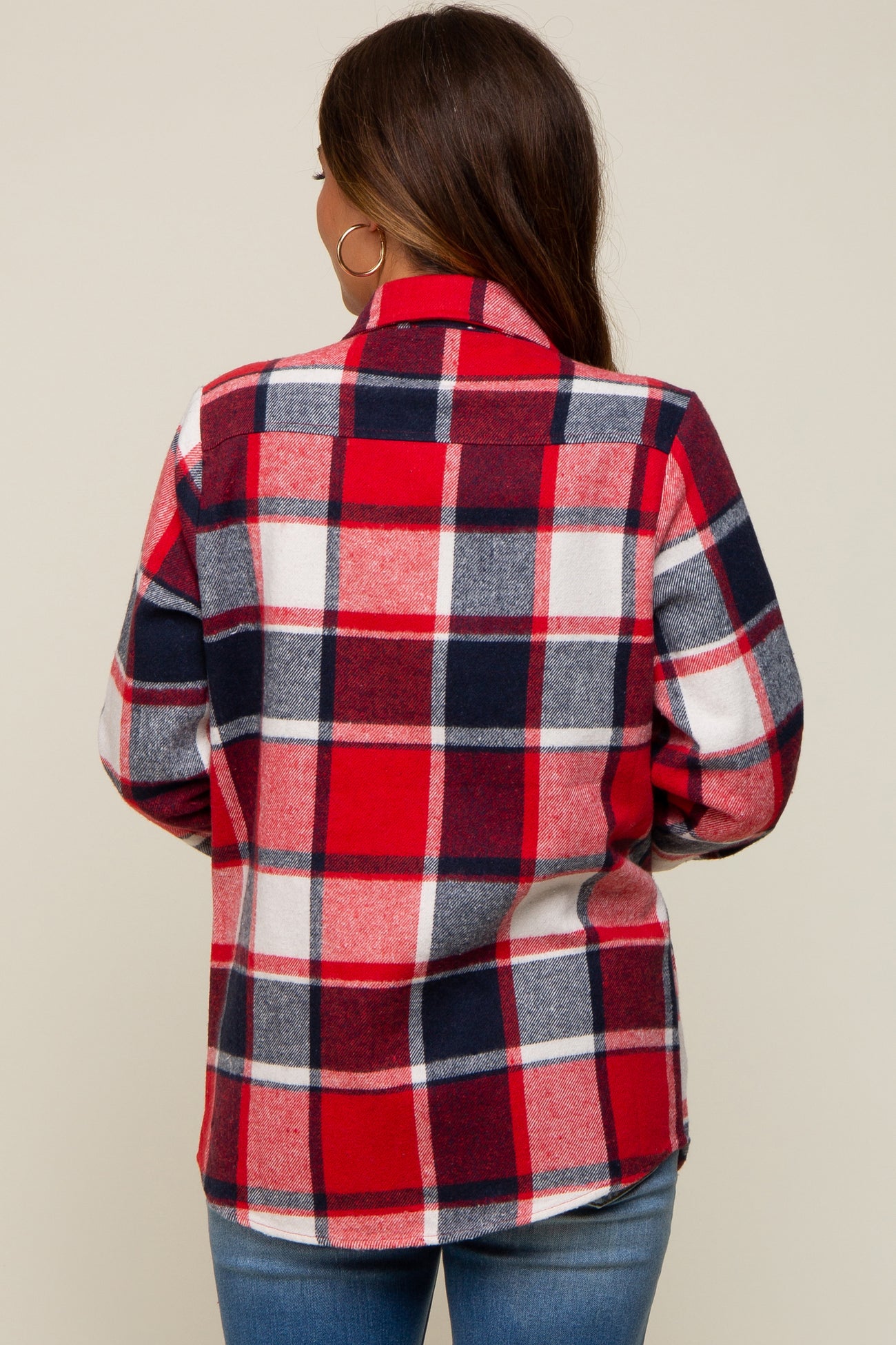 Details A plaid print maternity shirt jacket with a collared neckline, button front closure, two chest pockets and two side pockets. Content + Care