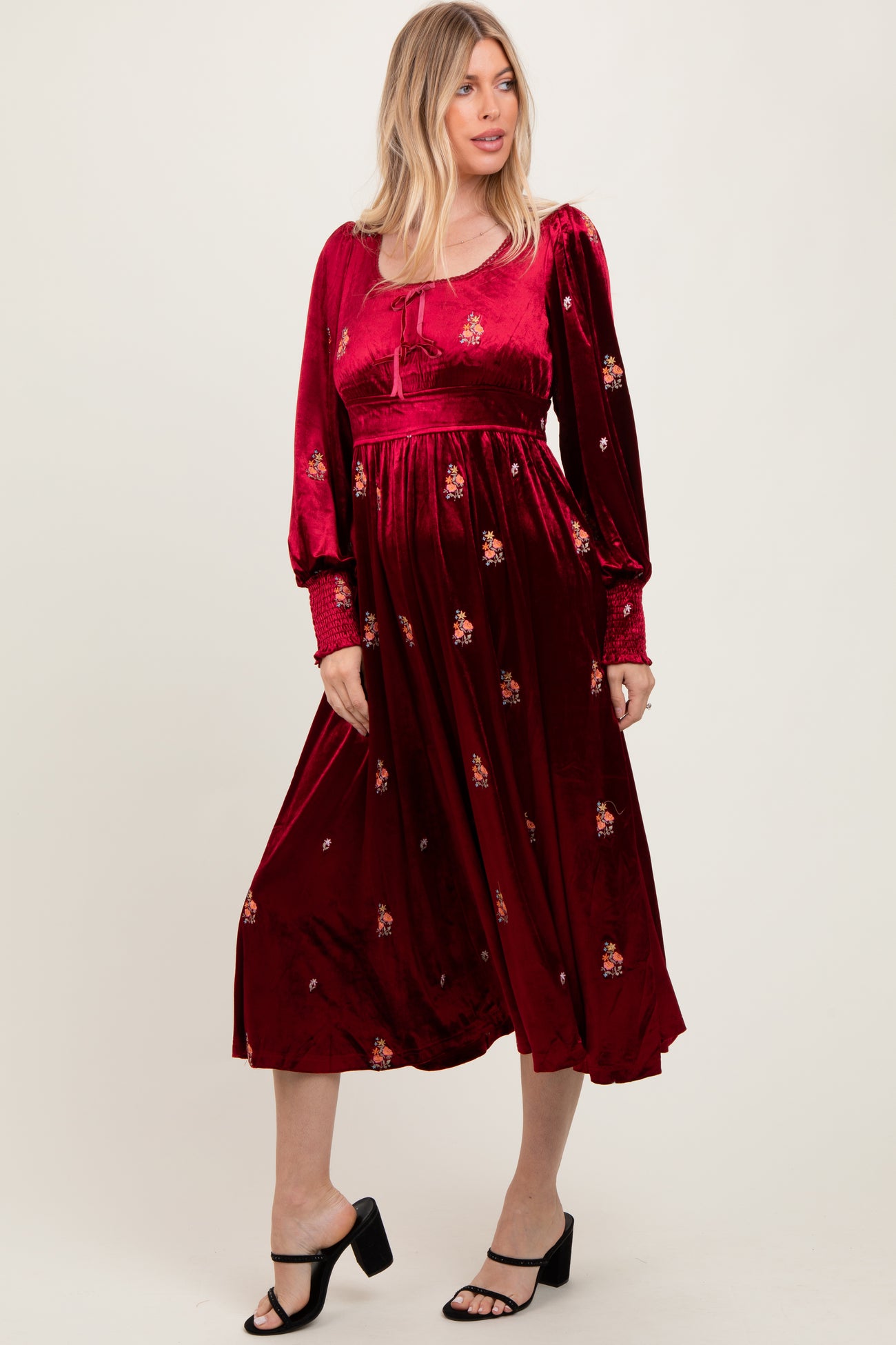Elevate your style with this Red Velvet Embroidered Floral Midi Dress. Crafted from luxurious velvet, this dress features delicate floral embroidery that adds a romantic touch. The midi length and flowy silhouette create an elegant and flattering fit, while the smocked cuffs and tie detail at the neckline enhance its feminine charm. Perfect for special occasions or a stylish night out, this dress combines comfort and sophistication effortlessly. Pair it with heels to complete your standout look. Make every moment memorable in this stunning velvet midi dress.