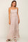 A printed maxi dress with smocked back, adjustable tie straps, ruffle trim accents and tiered body.
