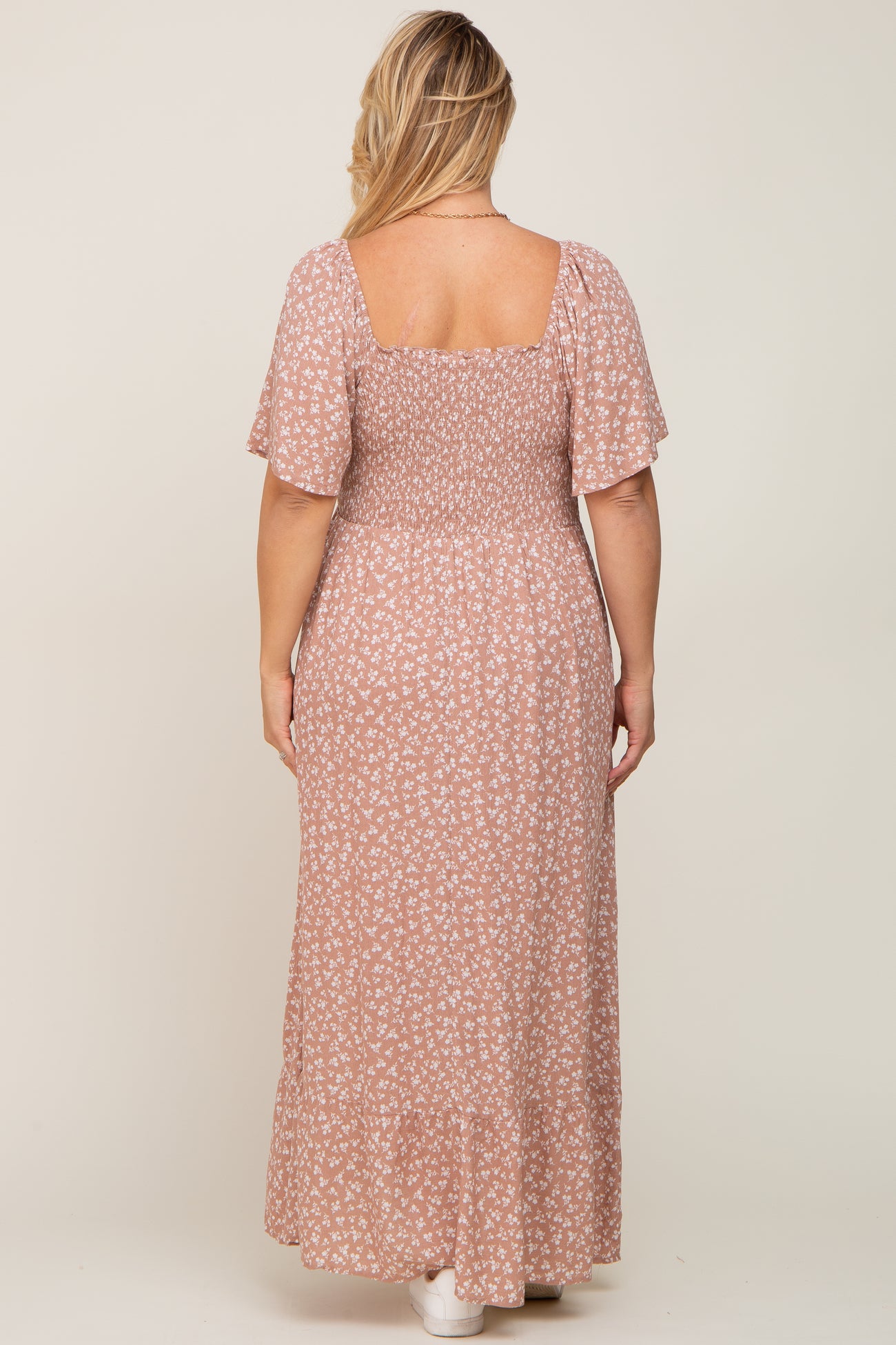Taupe Floral Smocked Flounce Sleeve Maternity Plus Maxi Dress