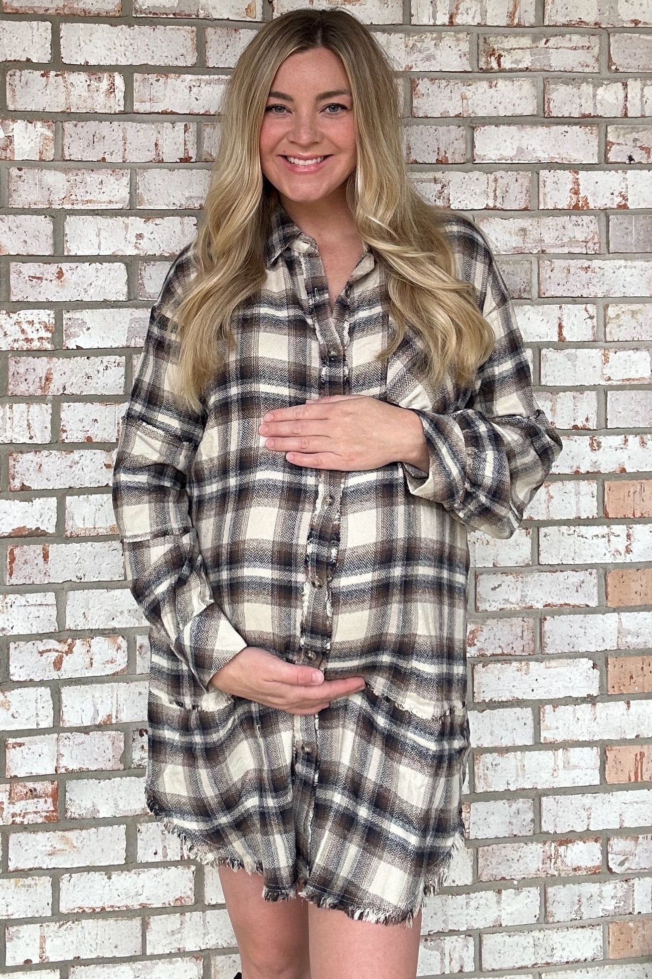 Taupe Plaid Button Down Raw Hem Maternity Dress
