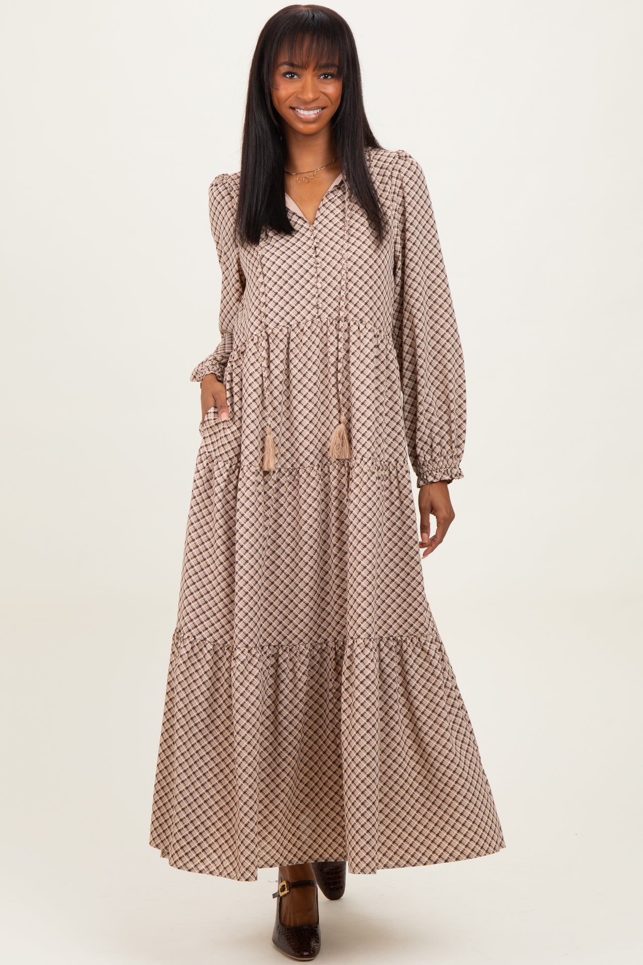 Elevate your wardrobe with our Taupe Plaid Tie Collar Tiered Maxi Dress. Featuring a classic plaid pattern in a versatile taupe shade, this dress offers a charming tie collar with tassel details and a flattering tiered silhouette. The long sleeves with elastic cuffs add a touch of elegance while ensuring comfort. Perfect for casual outings or dressier occasions, its maxi length creates a graceful and effortless look. Pair it with your favorite boots or heels for a stylish, timeless ensemble that's as comfortable as it is chic. Available now for your everyday sophistication.