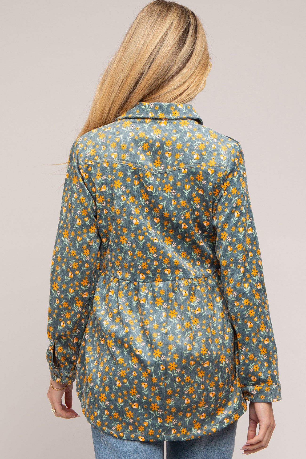 Details A floral corduroy maternity top with a collar, front functioning buttons, long sleeves, and a hi-lo hem. Content + Care