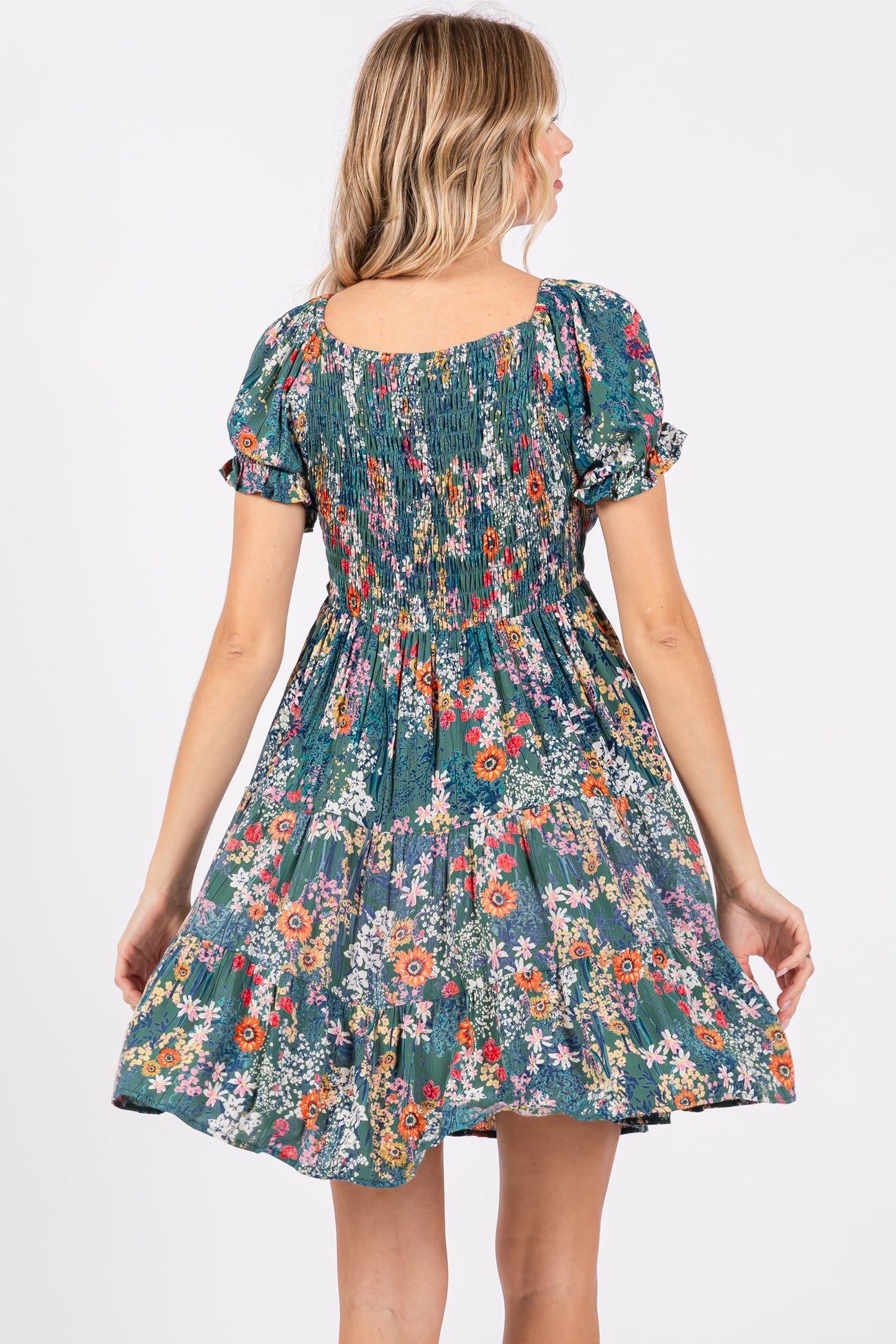 Teal Floral Smocked V-Neck Short Sleeve Dress