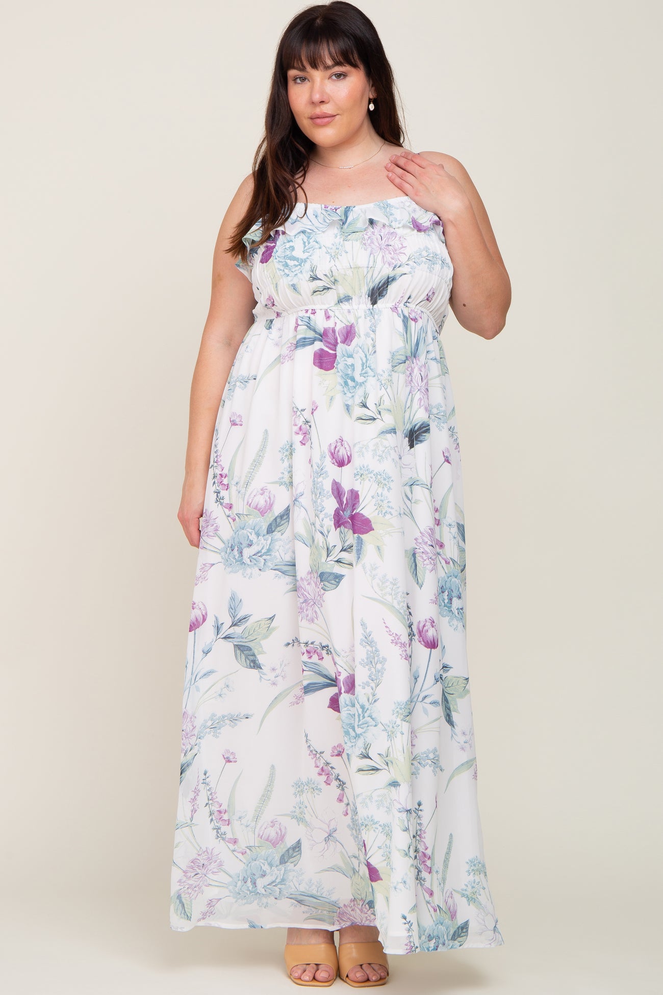 White Floral Sleeveless Ruffle Plus Maxi Dress