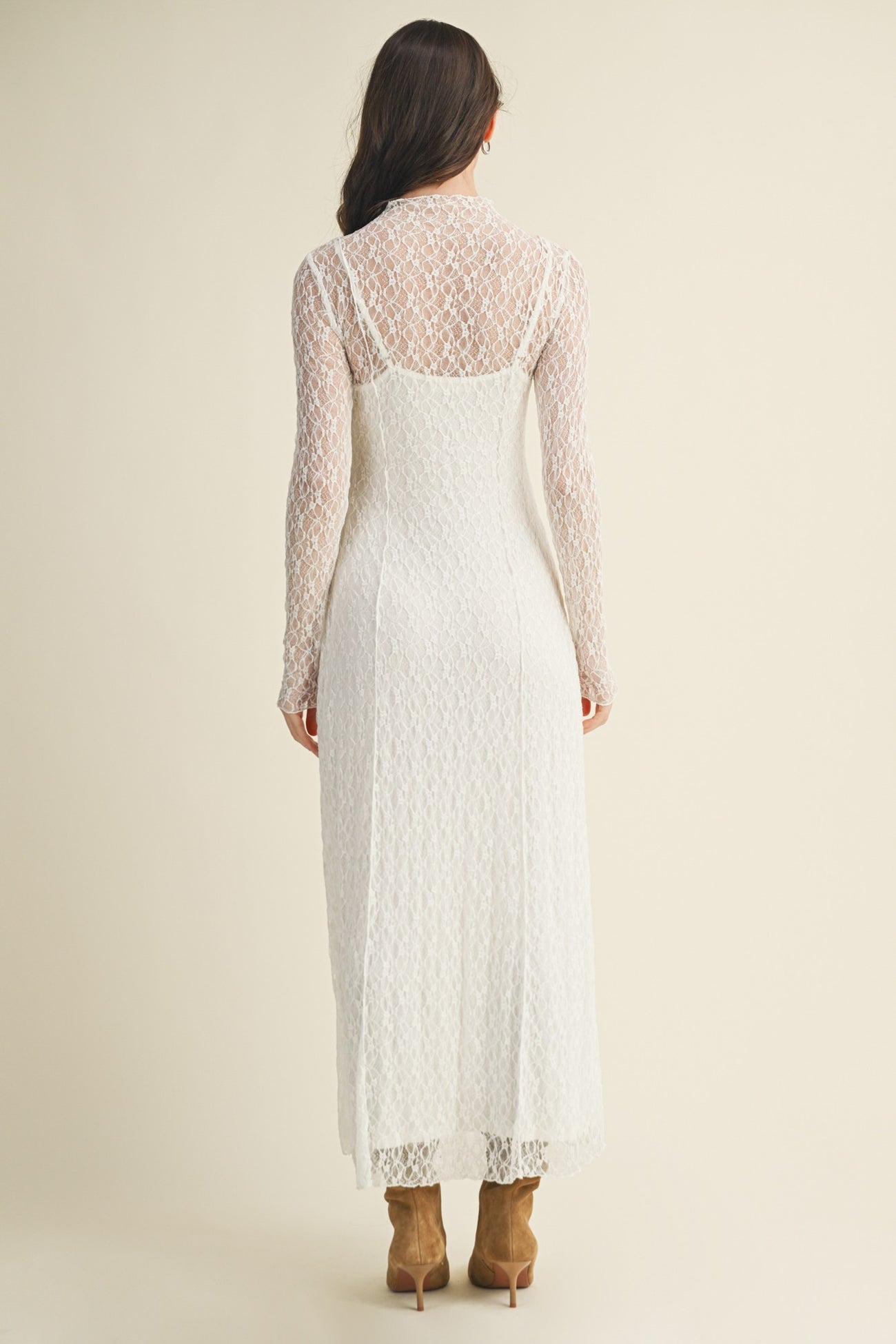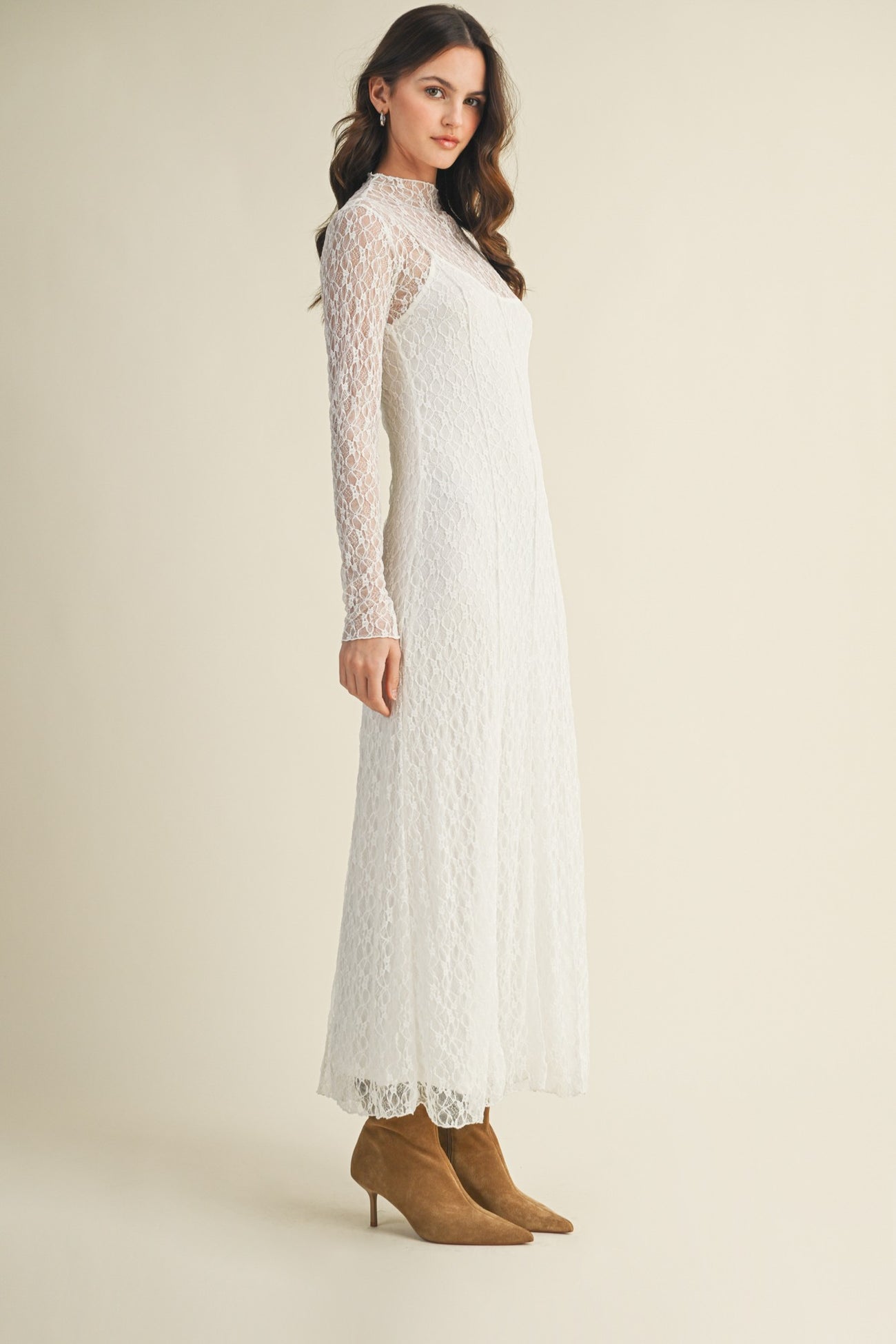 White Lace Mock Neck Long Sleeve Maxi Dress