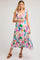 A watercolor print maternity midi dress featuring a squared neckline, ruffle straps, a smocked back, a ruffle accent at the waist, and a ruffle accent bottom tier. Skirt is lined 3/4 of the way down.