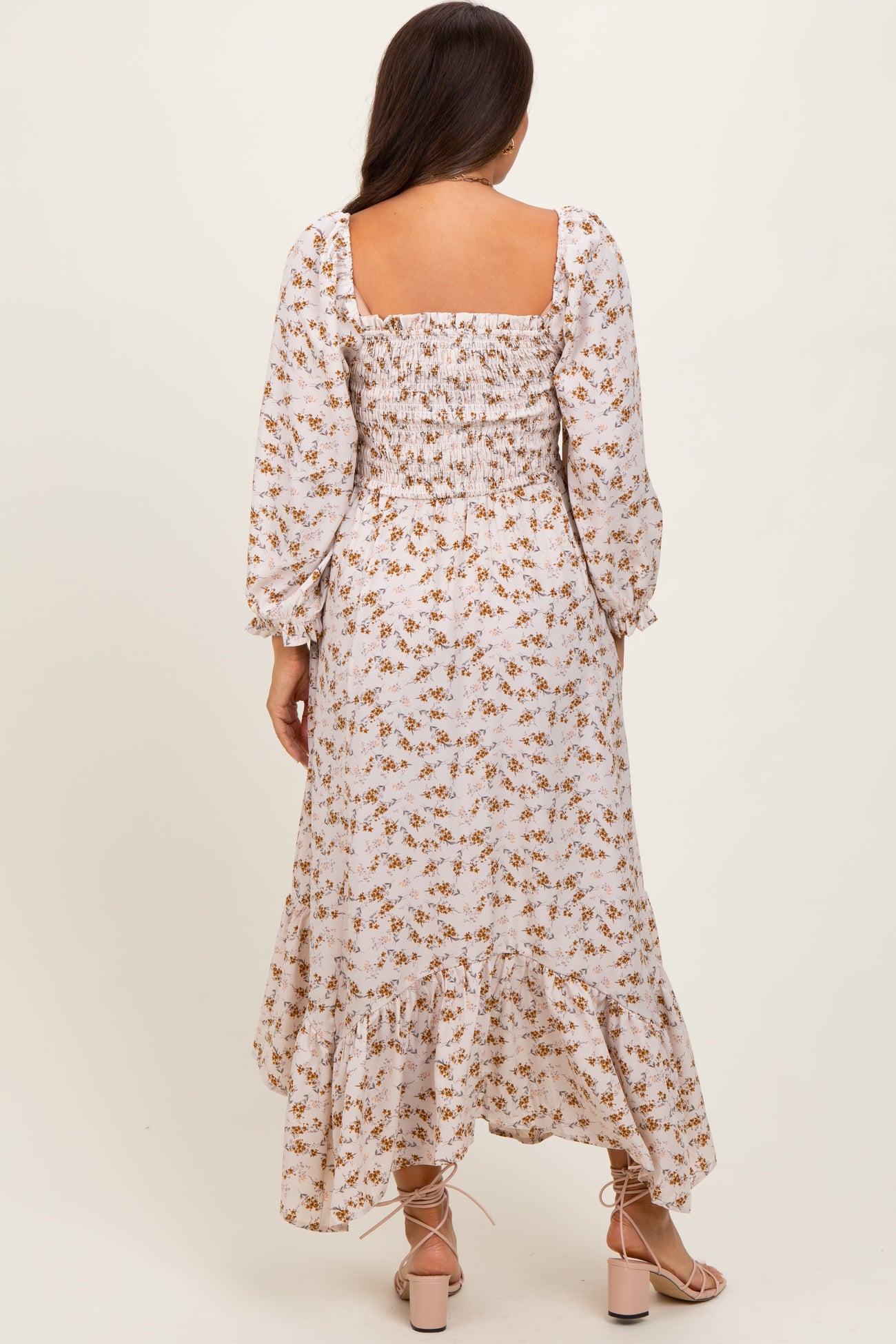 Ivory Floral Smocked Handkerchief Hem Maternity Maxi Dress