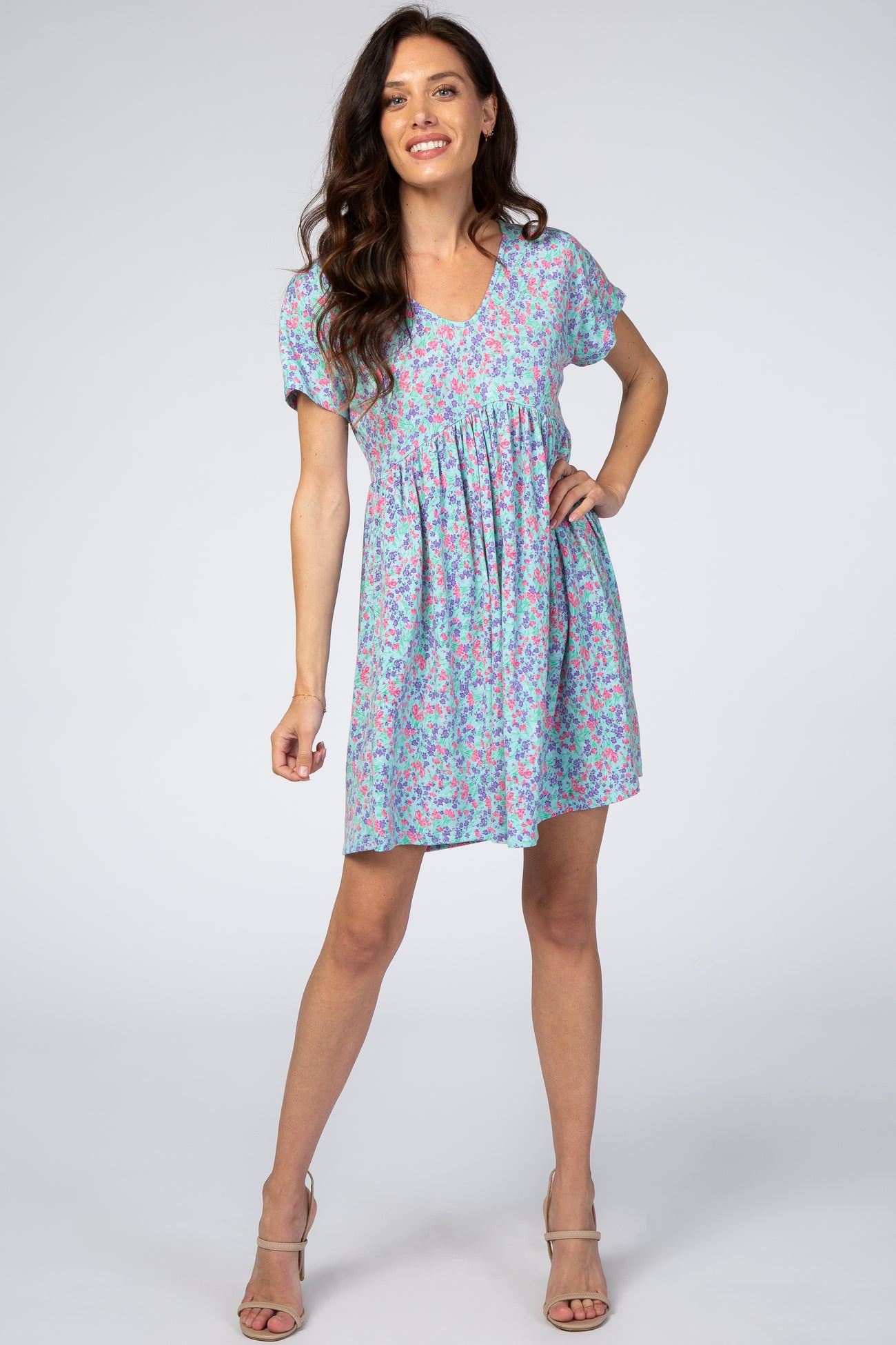 A floral print maternity dress with a v-neckline in a babydoll style.