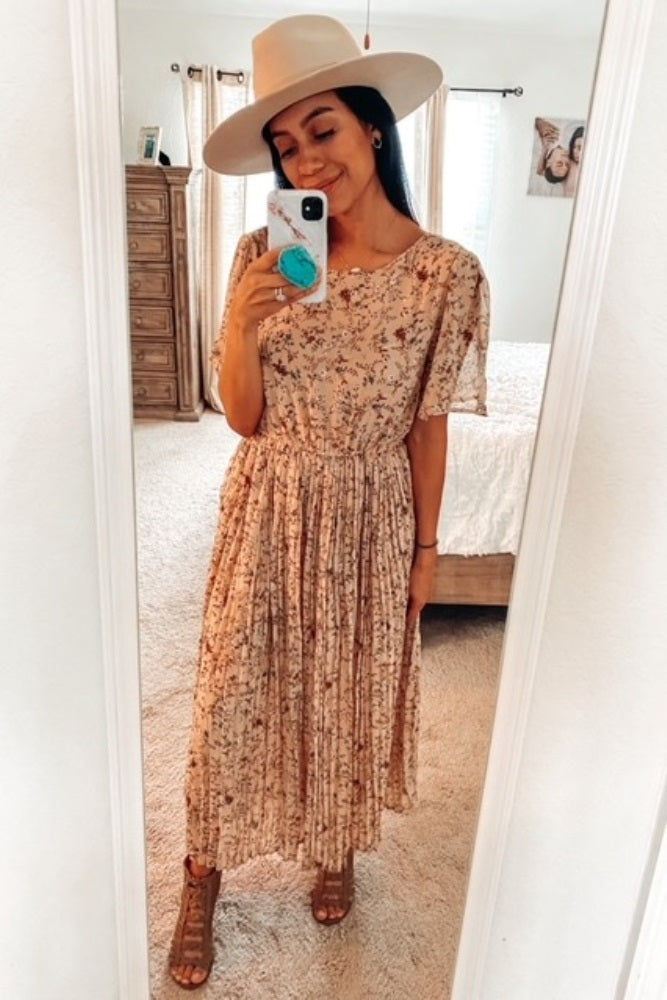 A chiffon midi dress featuring a rounded neckline, short ruffle sleeves, a pleated skirt, a keyhole back with a button closure and double lined for added coverage. This style runs big.