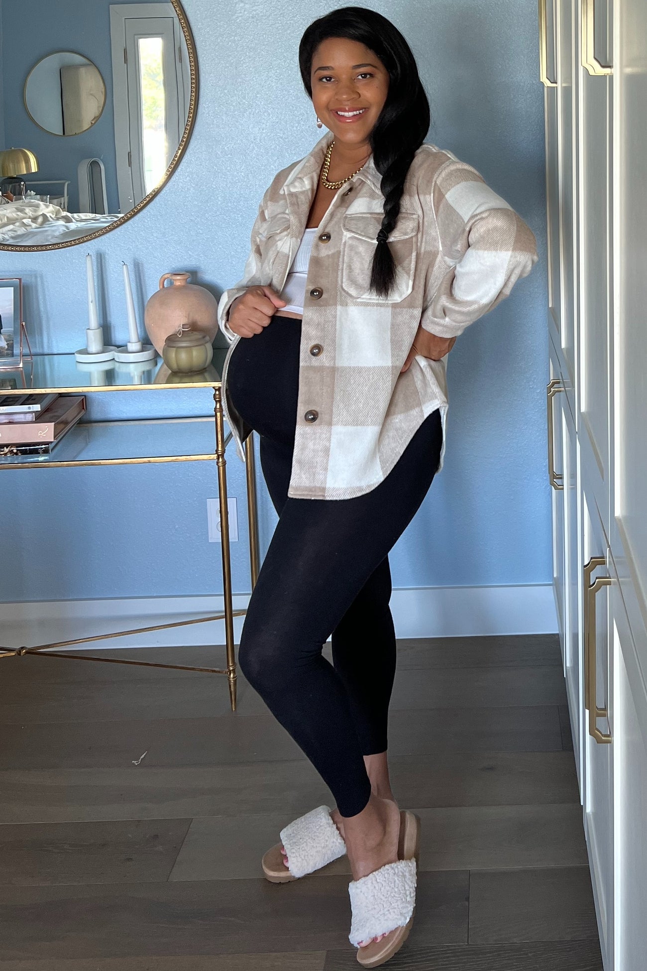 A thick knit maternity shirt jacket in a plaid print with a collared neckline, button front closure, and two front pockets.