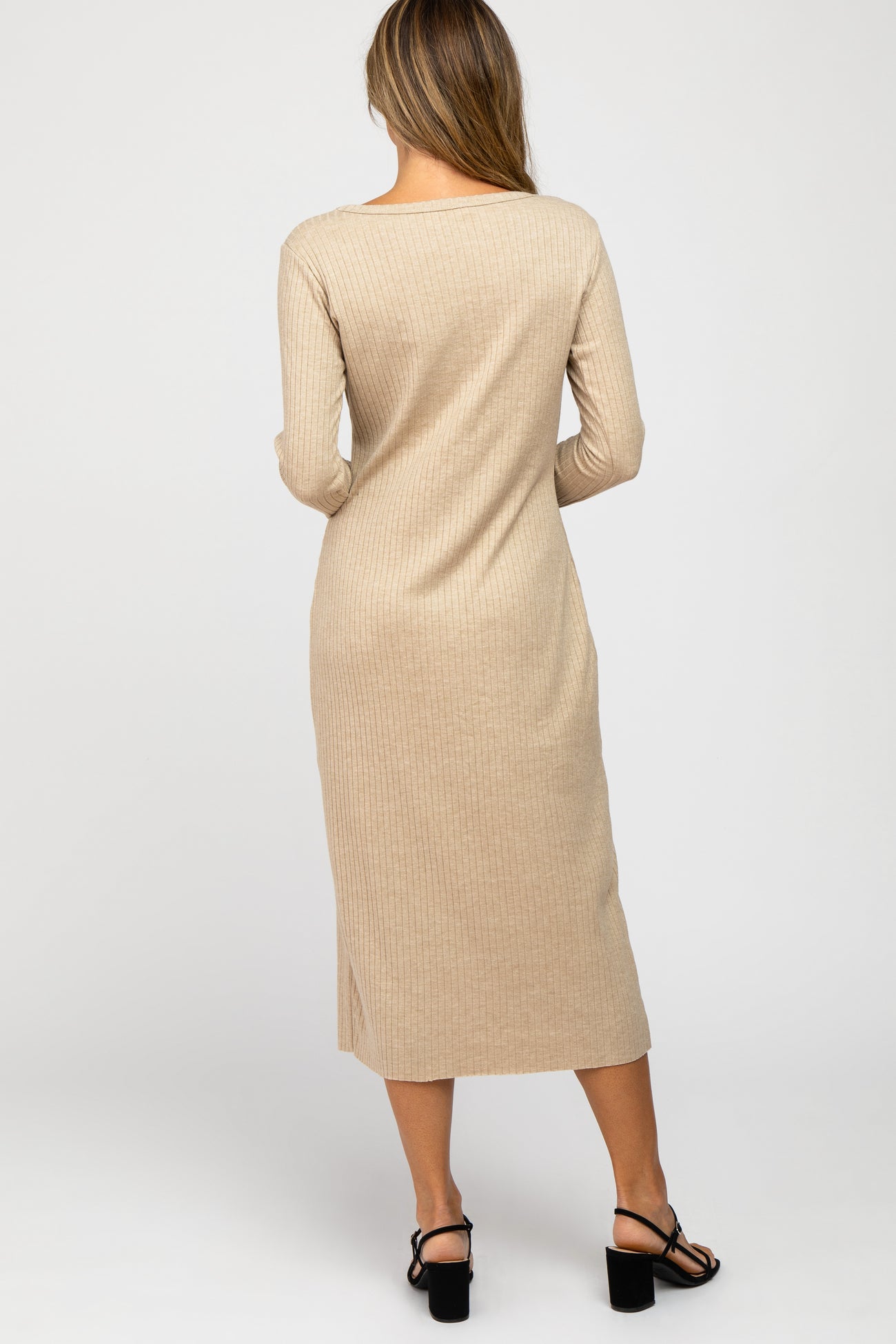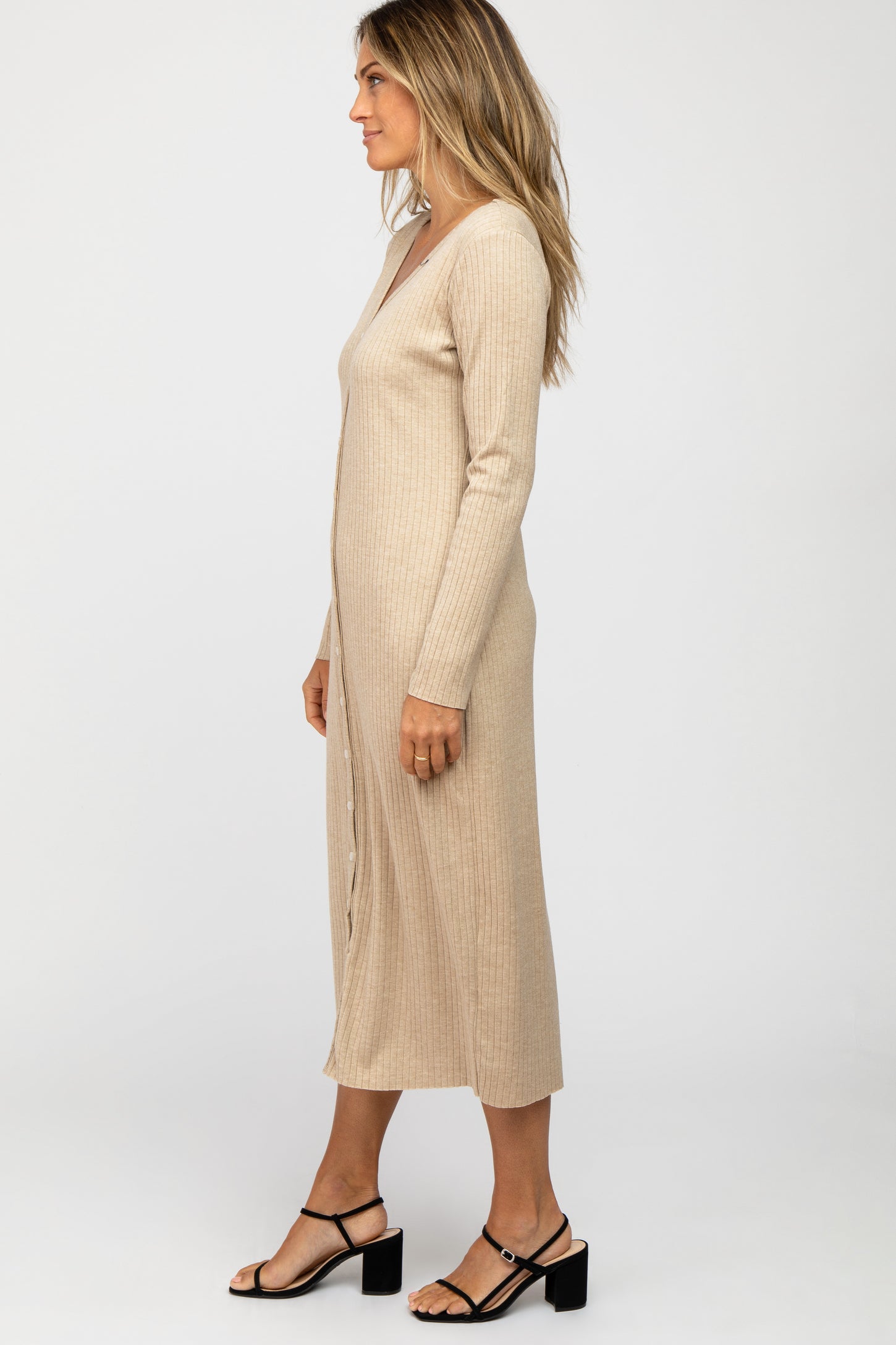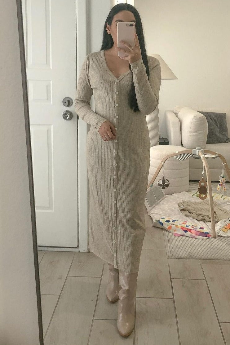 A ribbed midi cardigan dress featuring front buttons, long sleeves and a v-neckline.