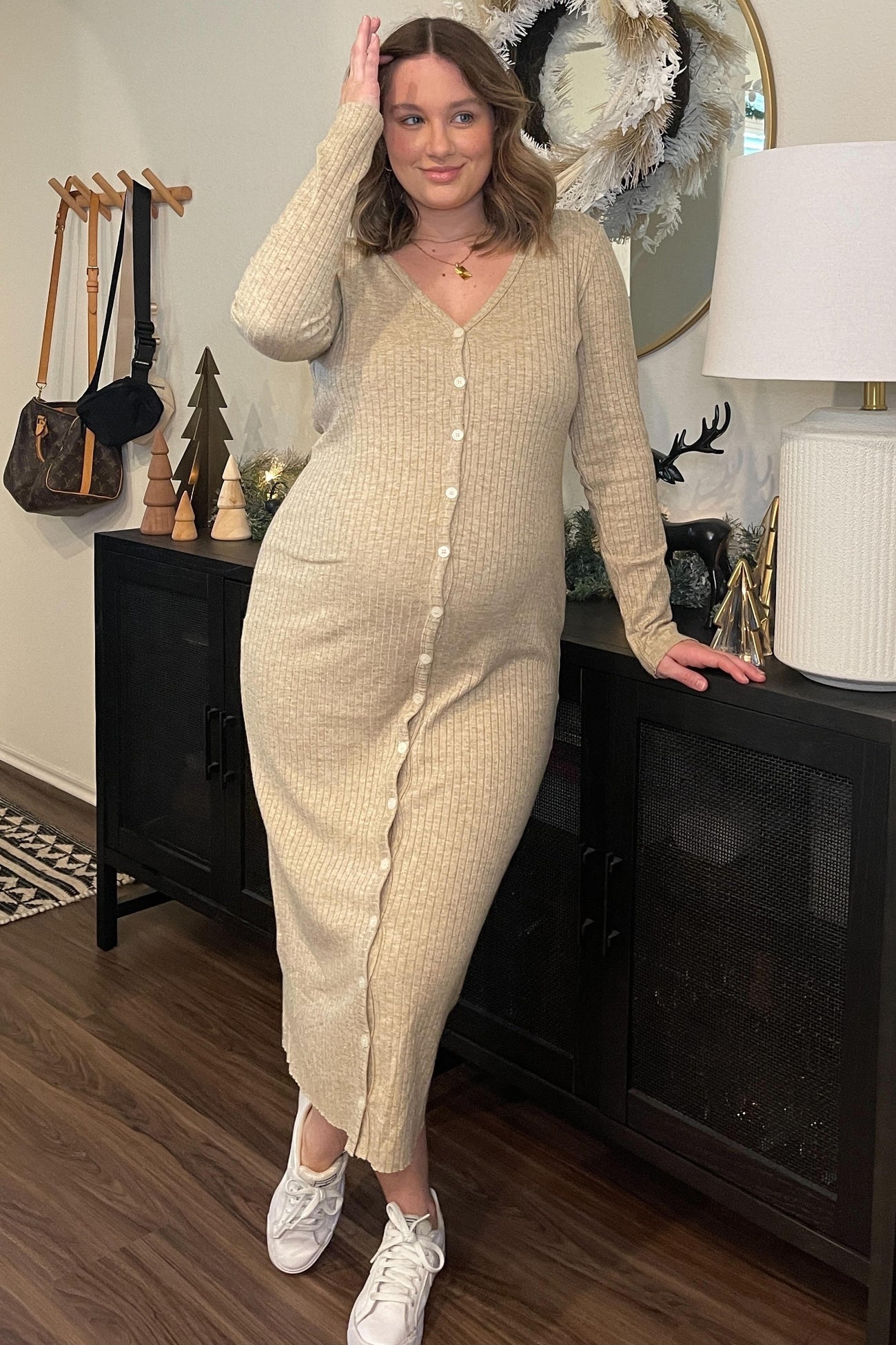 A ribbed maternity midi cardigan dress featuring front buttons, long sleeves and a v-neckline.