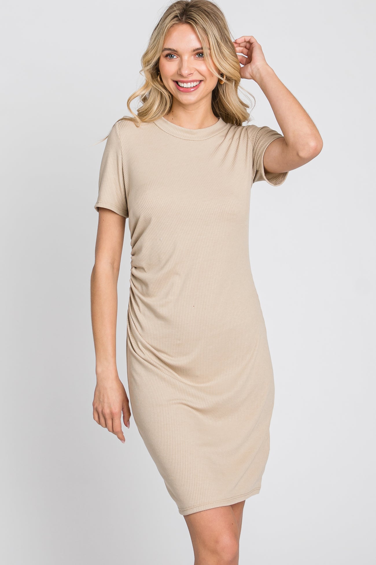 Beige Ribbed Ruched Side Fitted Short Sleeve Dress