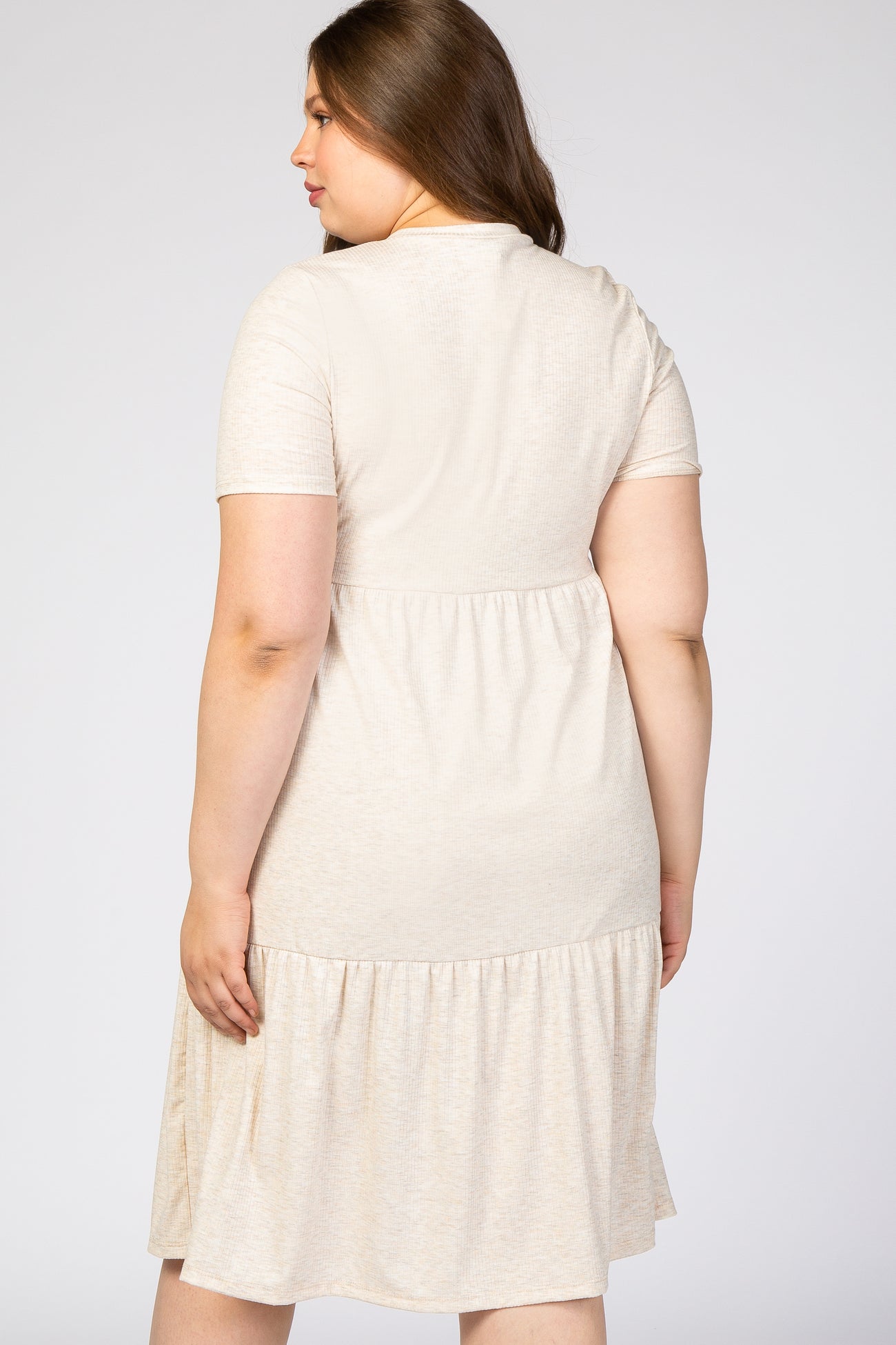A solid ribbed short sleeve maternity plus dress with scoop neckline and tiered body.