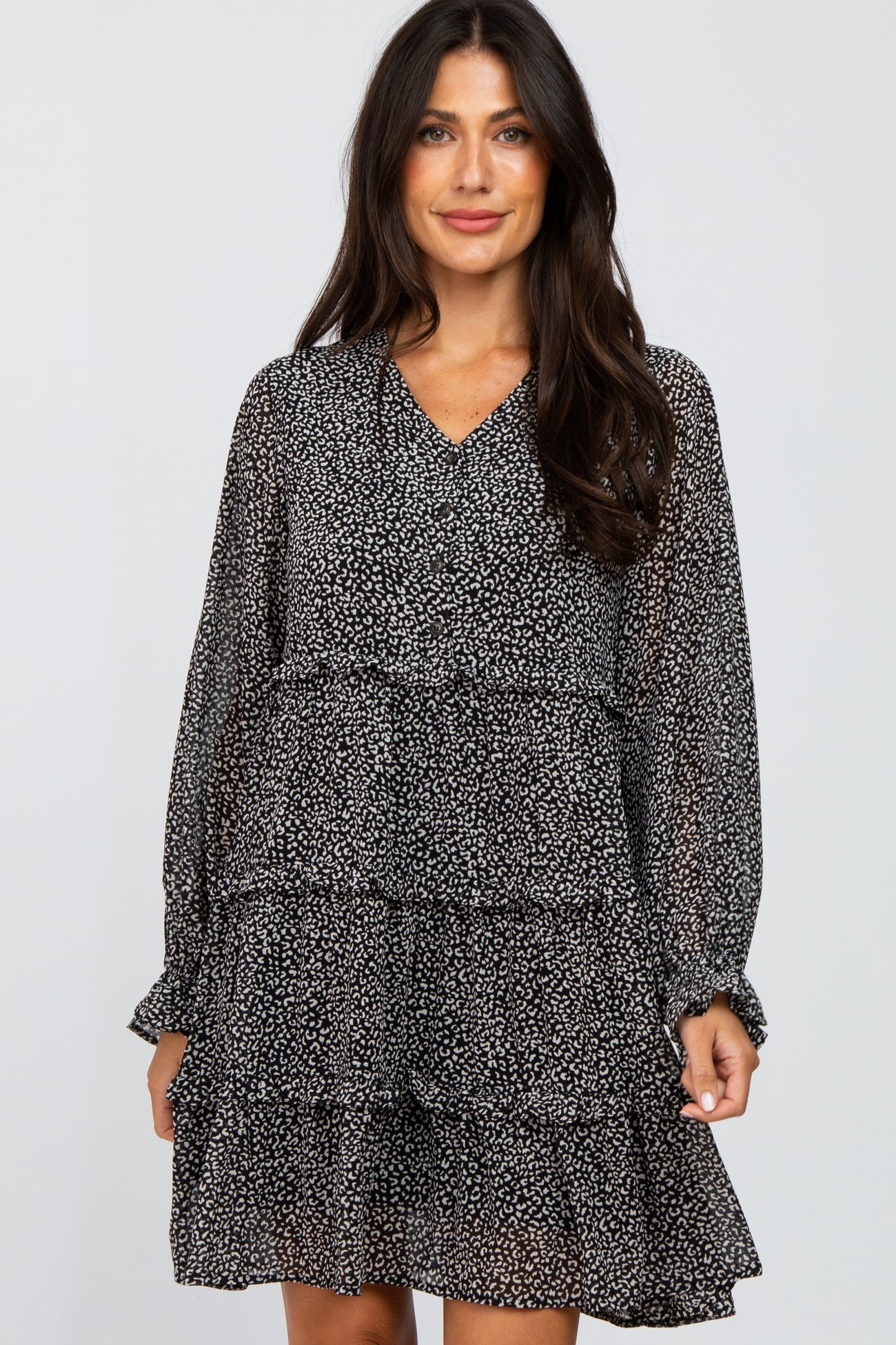 Details A printed long sleeve short dress. Features function button down detail in front, ruffle accent tiers on skirt and semi-sheer bubble sleeves. Body is lined. Content + Care