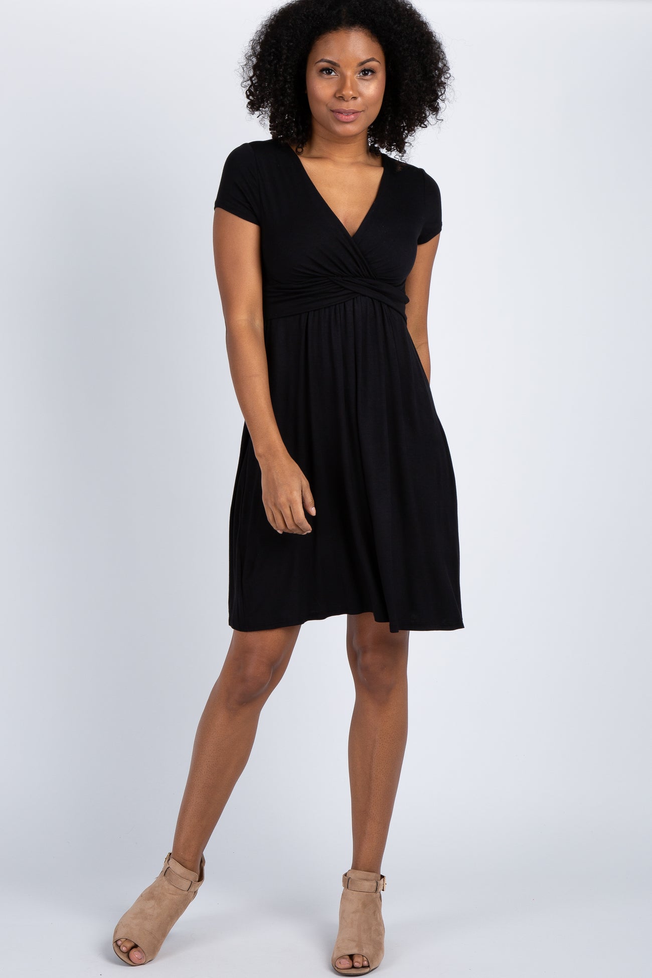 A solid hued dress featuring a draped v-neckline, cinched under the bust with wrap style, pleated accent on front and back, and short sleeves.