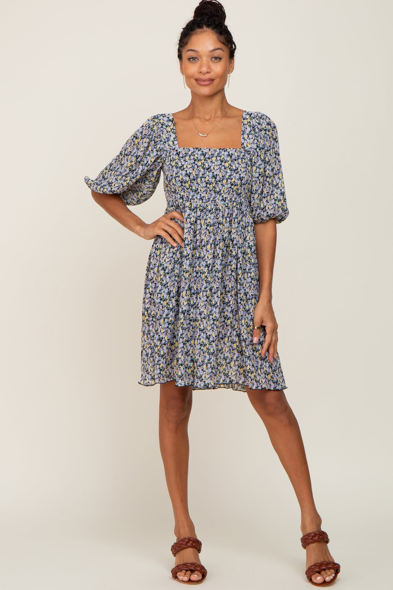 Details A floral pleated dress featuring a squared neckline, half length puff sleeves, a smocked bust, and side pockets. Content + Care