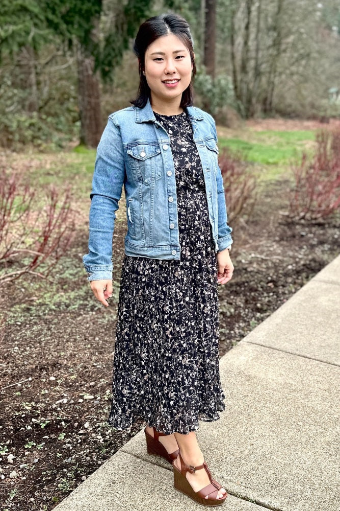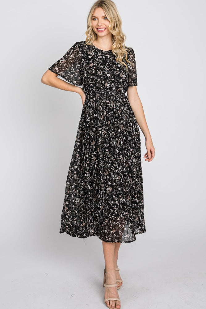Black Floral Pleated Short Sleeve Chiffon Midi Dress