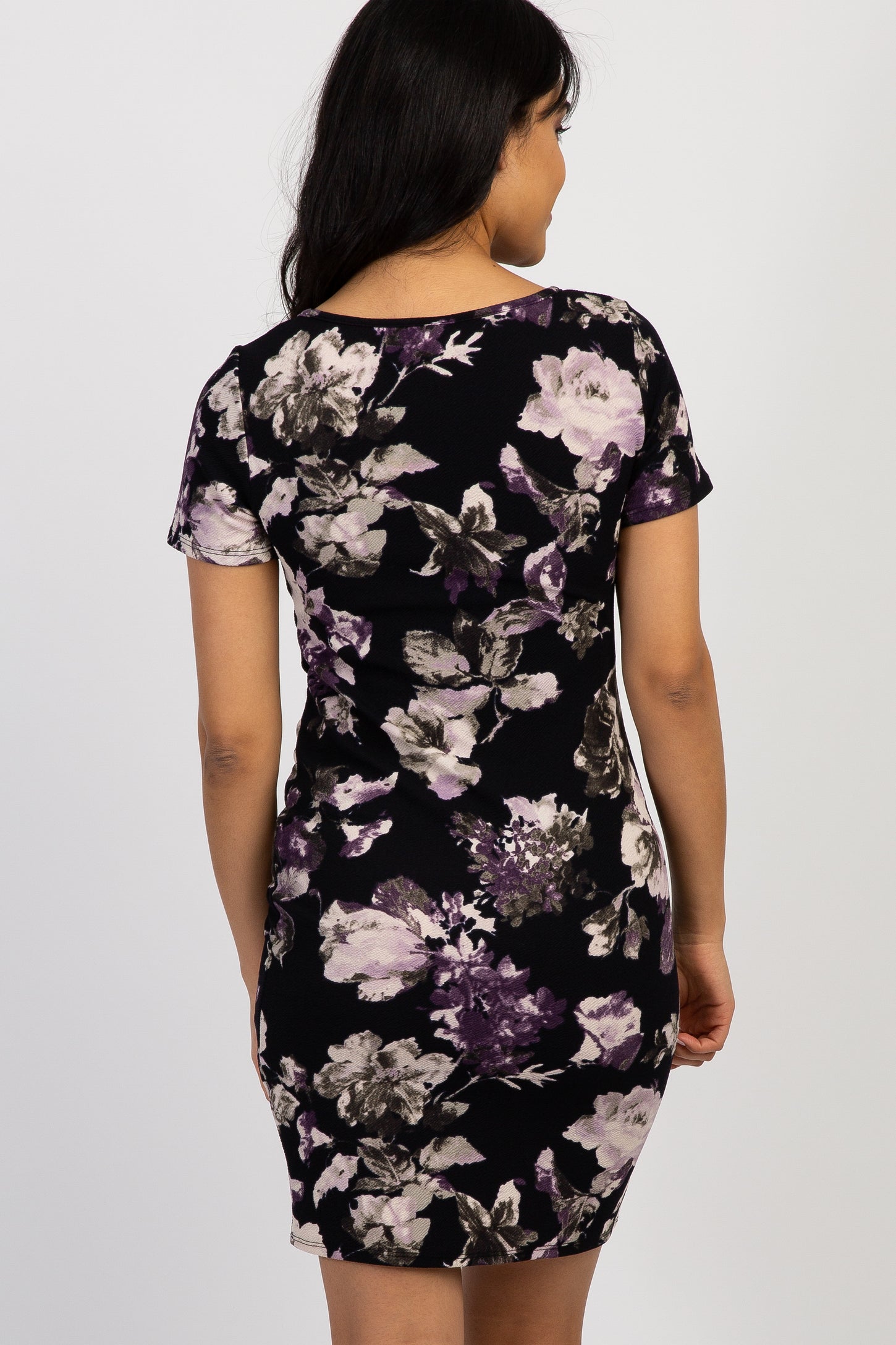 A floral print, fitted maternity dress with short sleeves and a rounded neckline.