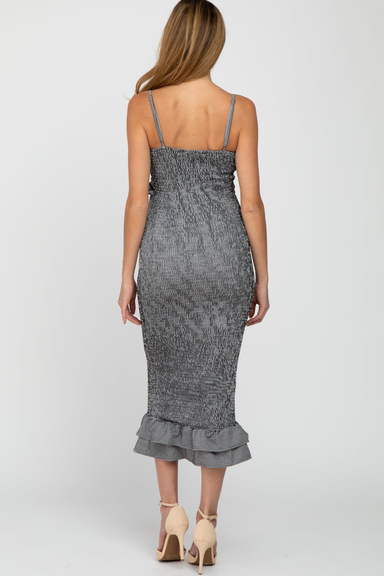 A gingham print smocked fitted maternity midi dress featuring a self-tie bust, adjustable cami straps and a ruffle hem.