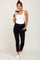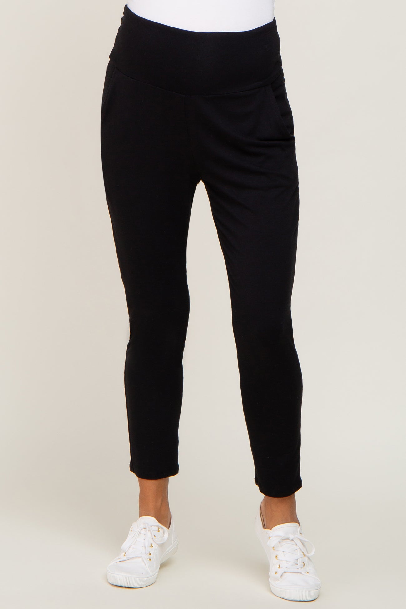 A pair of solid maternity knit pants with a high waist fit, a wide waistband, and side pockets.