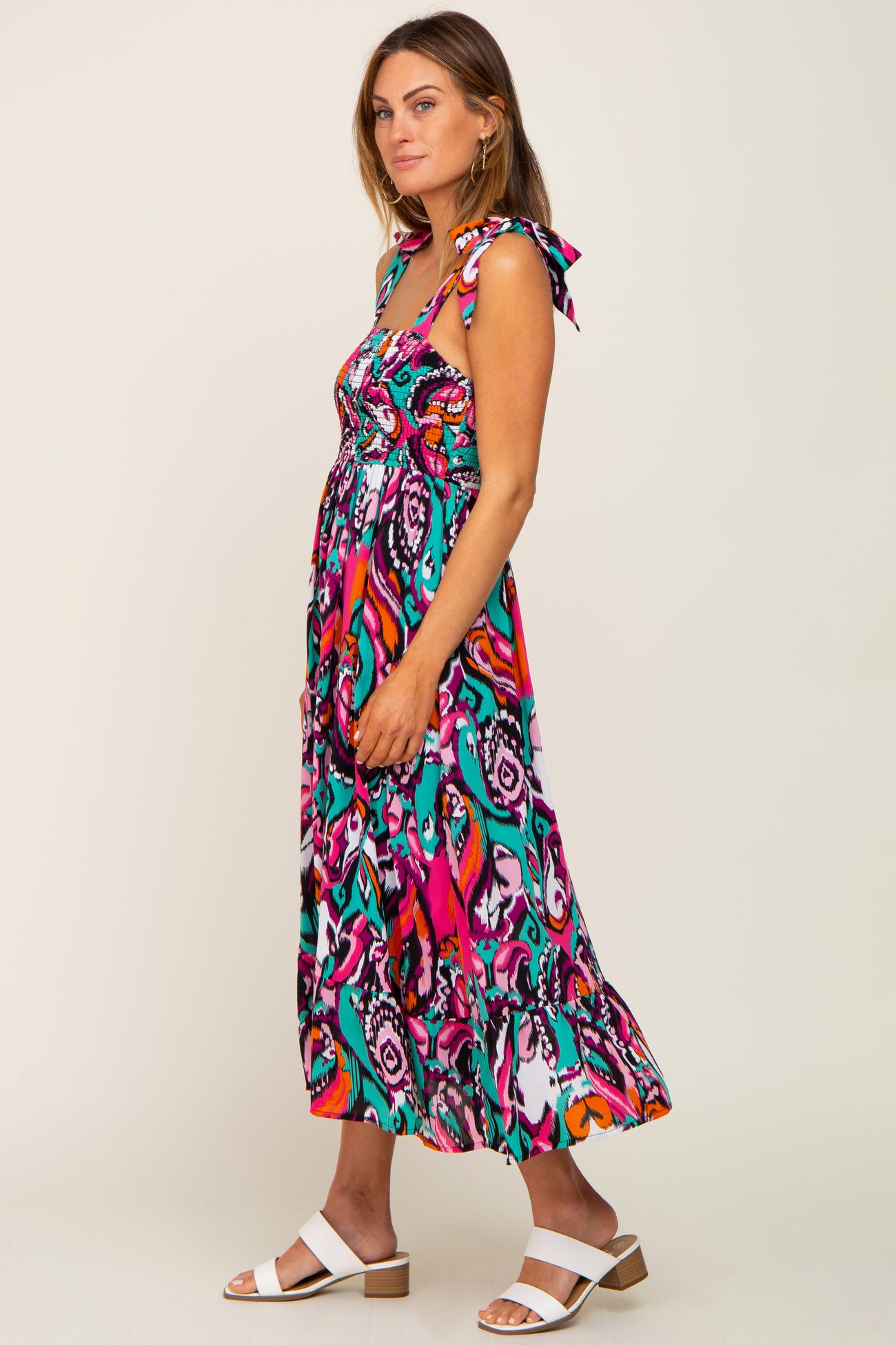 A printed midi with adjustable shoulder ties, a smocked bodice, and a lined skirt.