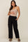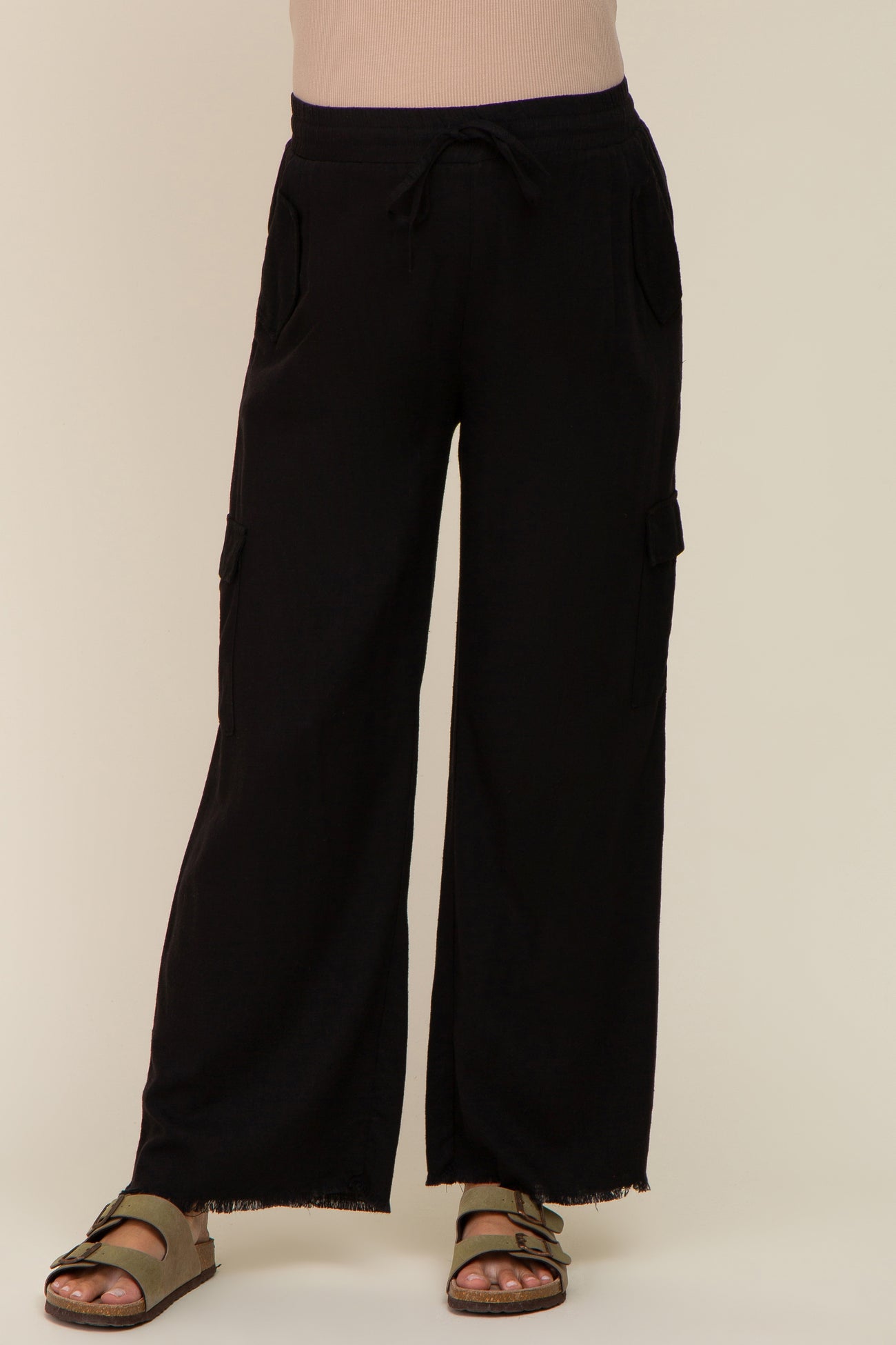Details A pair of linen maternity pants with an elastic drawstring waistband, side pockets with a faux flap, side leg pockets, and a raw hem. Content + Care