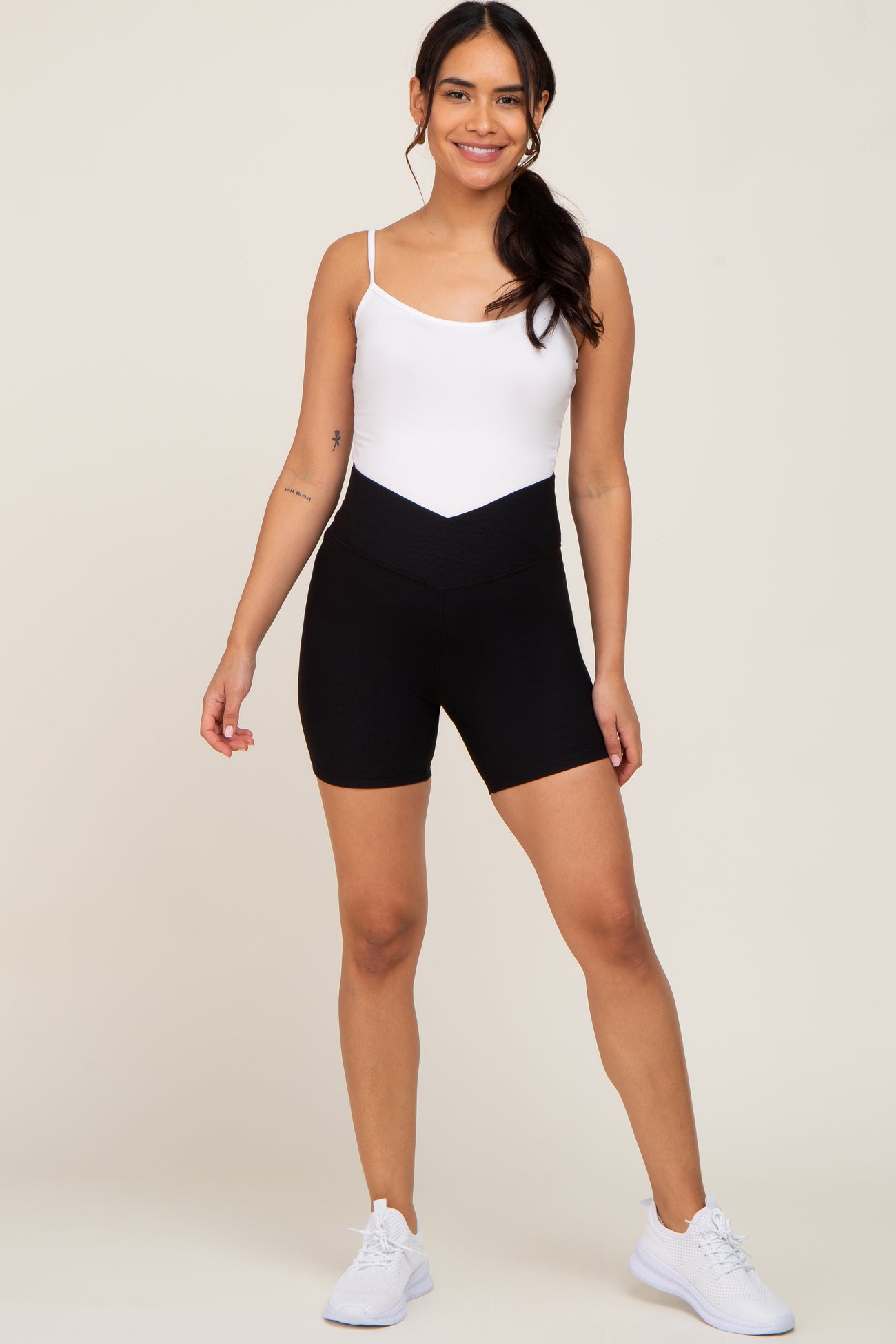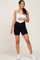 A pair of ribbed maternity biker shorts featuring a crisscross waistband.
