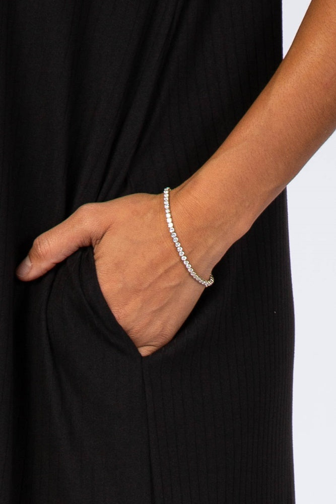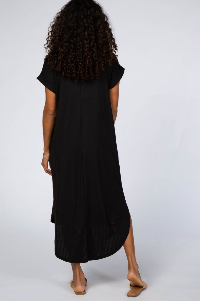 A ribbed midi dress featuring short cuffed sleeves, a curved hem, side pockets and a rounded neckline.