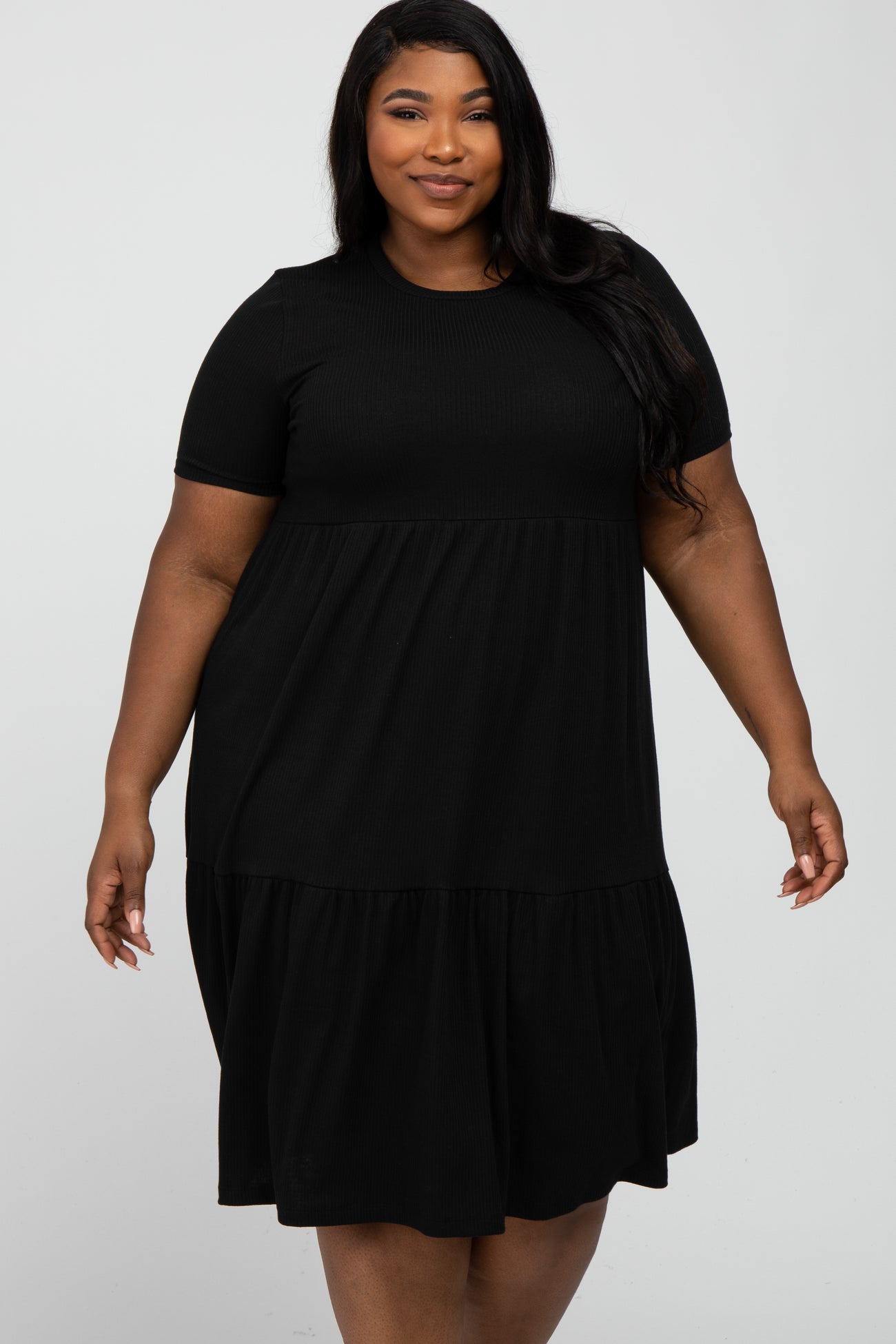 A solid ribbed short sleeve plus dress with scoop neckline and tiered body.