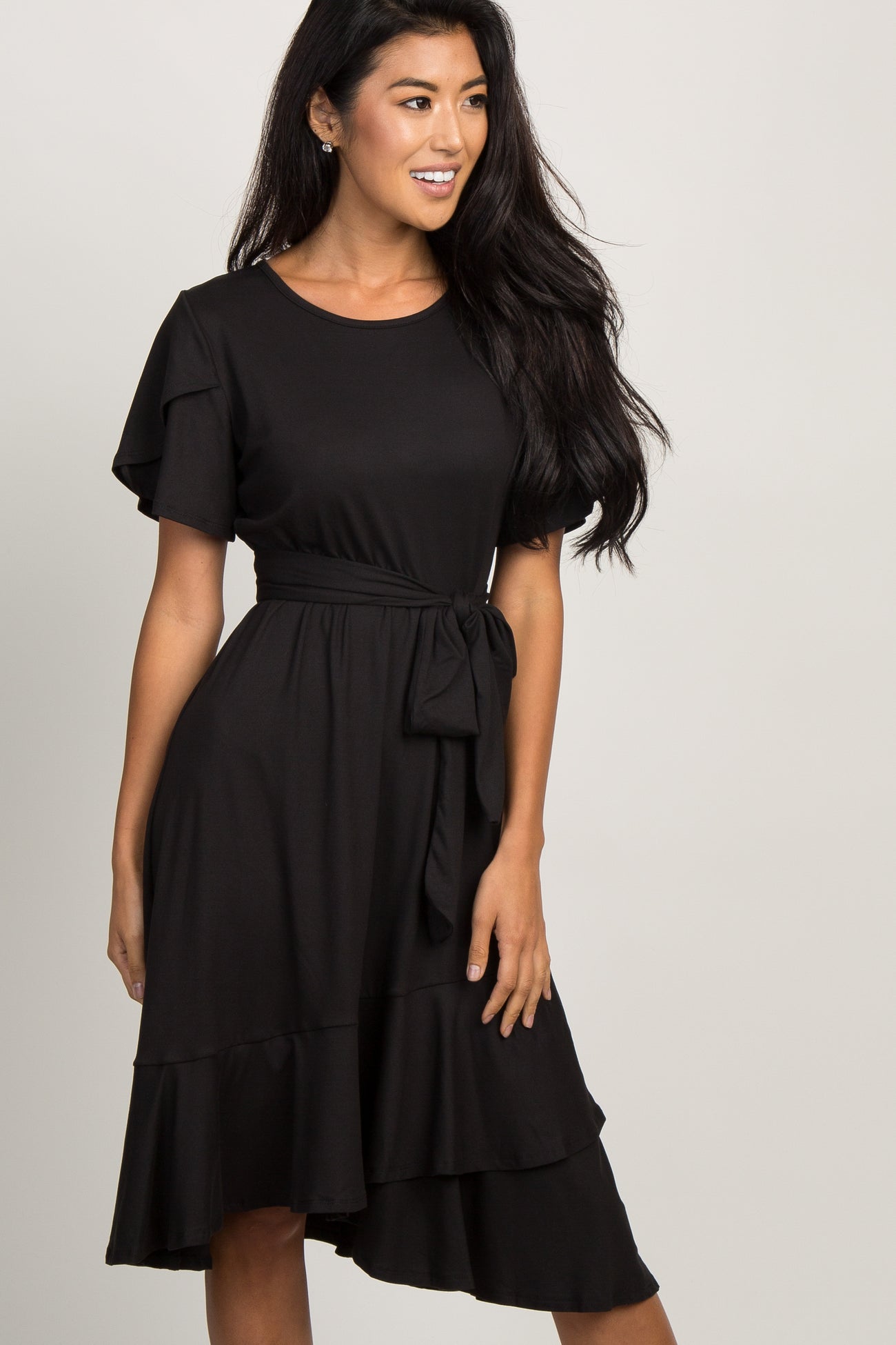 Black Solid Flounce Trim Dress