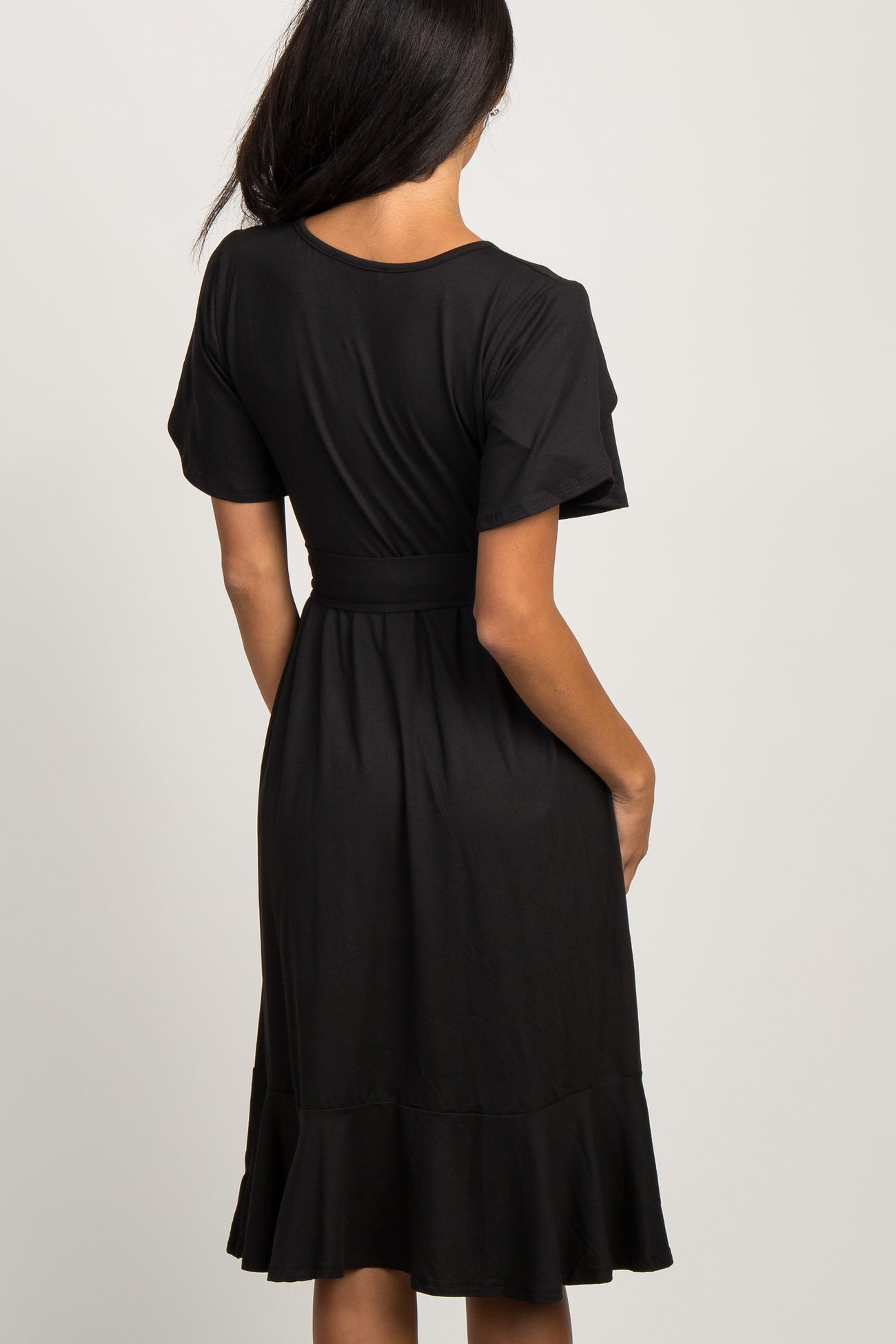 A solid hued dress with a flounce trim, a cinched elastic waistline, a sash tie, and a rounded neckline. Featuring wrap style on short sleeves and hemline.