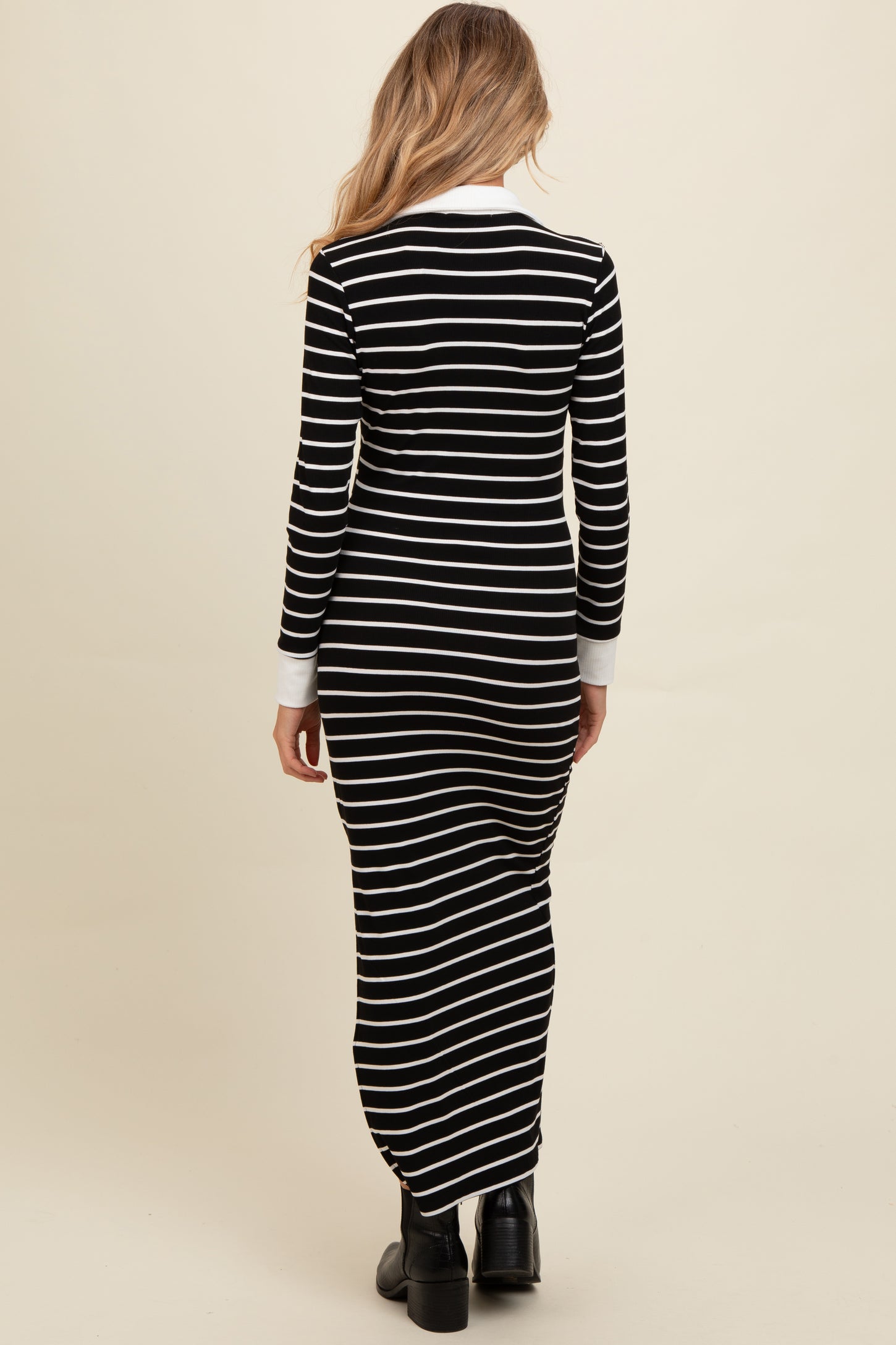 Black Striped Collared Long Sleeve Maternity Midi Dress