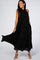 Details A solid, sleeveless maxi dress with a ruffled high neckline, a tie neckline, a tiered body, and double lined to prevent sheerness. Content + Care