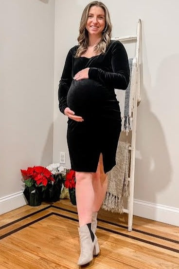 Turn heads at any event in this luxurious velvet long sleeve maternity dress. Designed to flatter your bump with a graceful silhouette, it features a stunning side slit for both style and added comfort. Soft stretch velvet hugs your curves for a perfect fit through every trimester, while the classic neckline and elegant sleeves make it ideal for special occasions or chic evenings out. Pair it with your favorite accessories and feel sophisticated, confident, and comfortable all night long. Embrace your radiant maternity glow with this show-stopping piece!