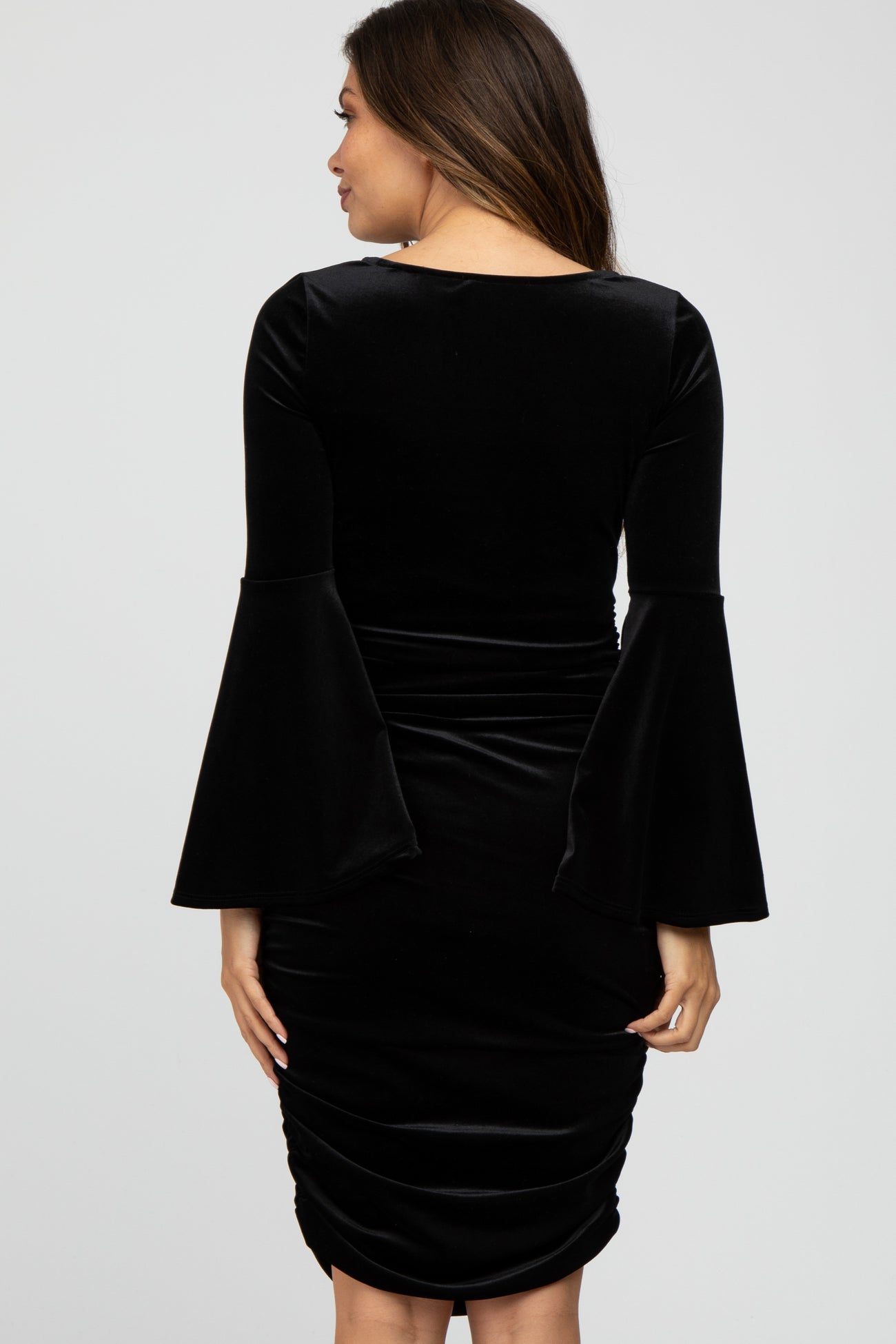 Black Velvet Ruched Bell Sleeve Maternity Dress