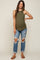 A pair of maternity jeans with heavy distressing at the knees, an elastic belly band, and a cuffed hem. Hem can be uncuffed. Material has high stretch.