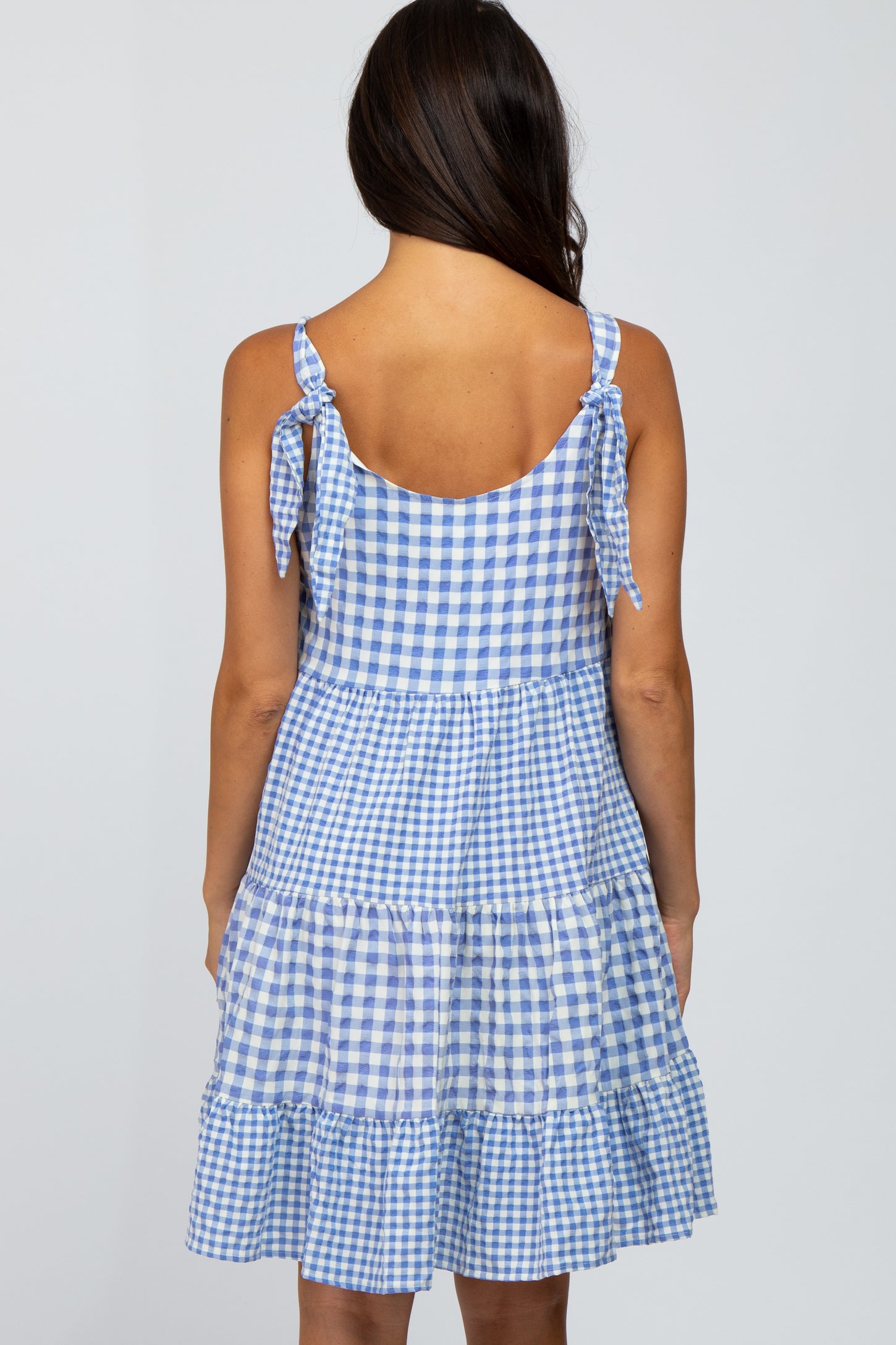 Details A gingham printed dress featuring adjustable shoulder ties, side pockets, and a tiered skirt. Content + Care