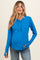 A solid hued maternity top featuring long sleeves with thumb holes, an exposed seam, front buttons and a curved hem.
