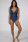 A solid hued one-piece swimsuit, featuring a deep v-neckline, adjustable straps with ruffle detailing, ruched sides, removeable padded cups and a double lining.