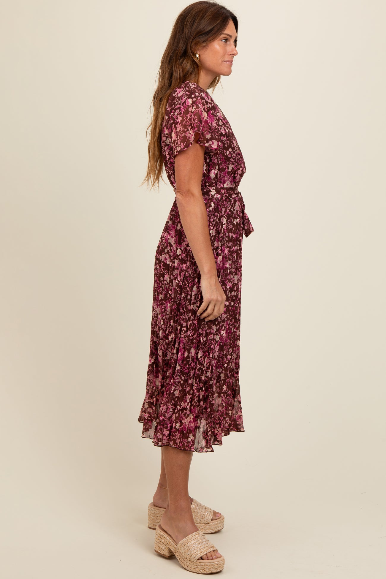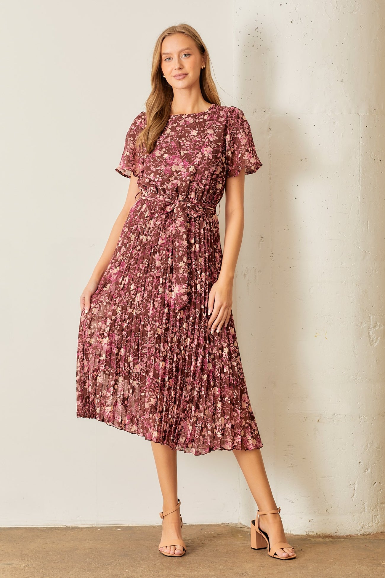 Elevate your wardrobe with this stunning floral pleated midi dress, designed to bring effortless elegance to any occasion. Featuring a flattering cinched waist and a flowy silhouette, this dress offers comfort without compromising on style. The delicate pleats add movement and texture, while the soft, breathable fabric ensures all-day wearability. Short flutter sleeves and a classic round neckline complete the look, making it perfect for both casual outings and special events. Pair with wedges or sandals for a chic, feminine ensemble that always feels fresh and timeless.