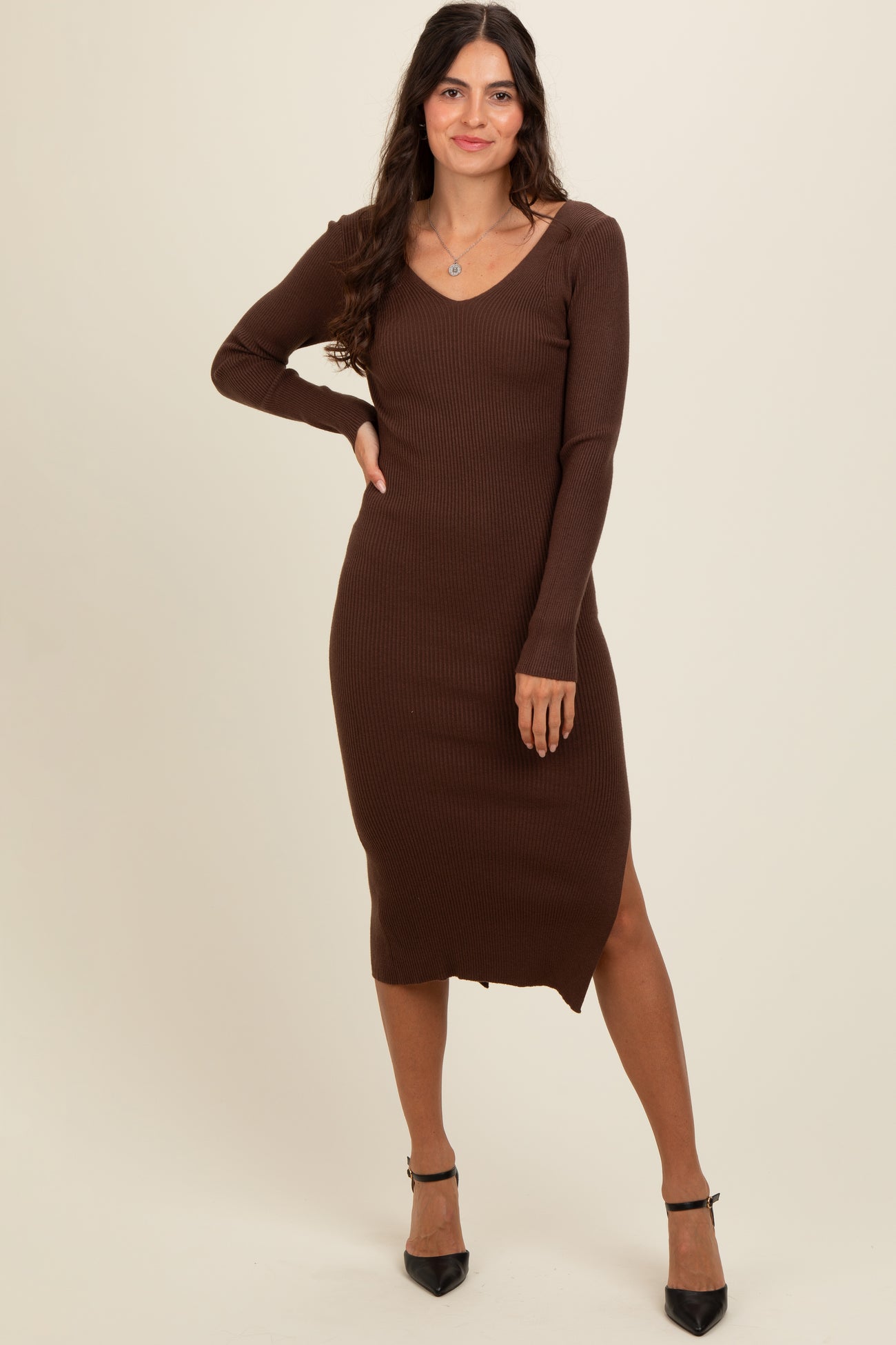 Brown Ribbed Knit Side Slit Maternity Midi Dress